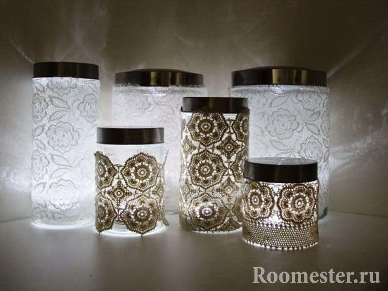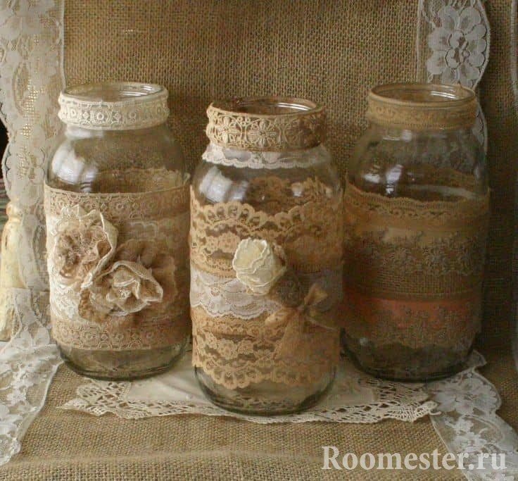 decoración en formato decoupage (pegue los frascos con servilletas con un patrón interesante);