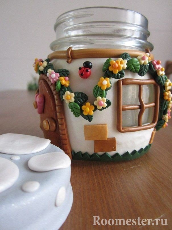 Después de las acciones técnicas, pegue el frasco con un paño hermoso, dejando abierta su parte superior, sobre la cual se coloca la tapa. Después de haber distribuido los artículos pequeños en los frascos, cierre las tapas y adhiérase a cada inscripción que indique lo que hay en el frasco.