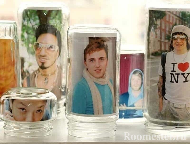 Puede pegar sobre un vaso vacío con algo discreto, para no interrumpir la vista en la foto. Puede pintar el frasco con pinturas comunes o aplicar cualquiera de las opciones de diseño anteriores, dejando espacio para fotos. Puede hacer un collage interesante.