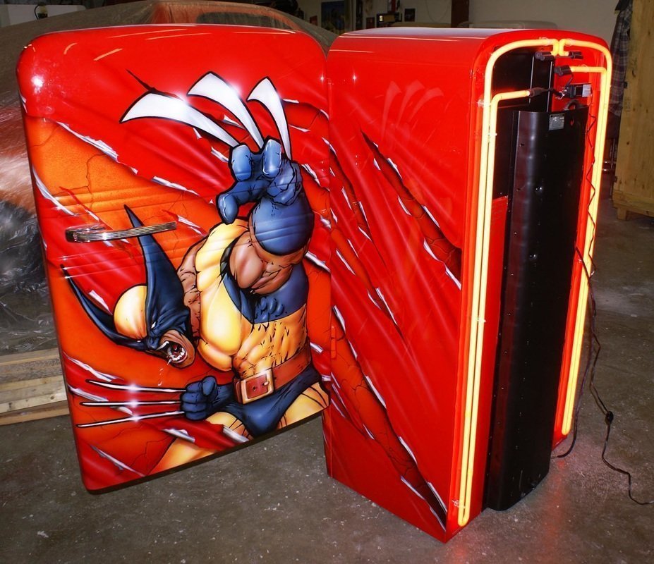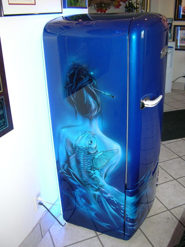 Debido a la complejidad de la ejecución, esta técnica es difícil de recomendar como idea de decoración en casa.Solo un profesional en un taller de pintura puede decorar electrodomésticos mediante la aplicación de aerografía, ya que el equipo profesional para aplicar pintura bajo presión se utiliza para el trabajo. Un estiramiento se puede atribuir al dibujo de aerografía aficionado con latas de aerosol y una plantilla preparada previamente. En este caso, es suficiente con preparar o descargar una plantilla del dibujo que le guste, cortar los contornos con un cuchillo de oficina.