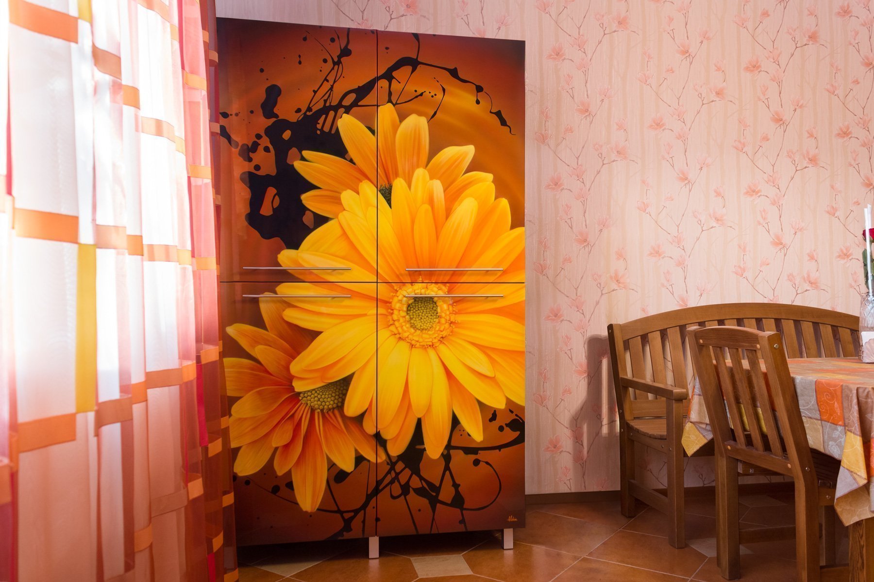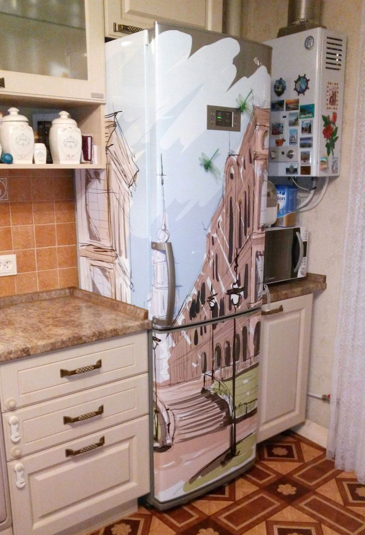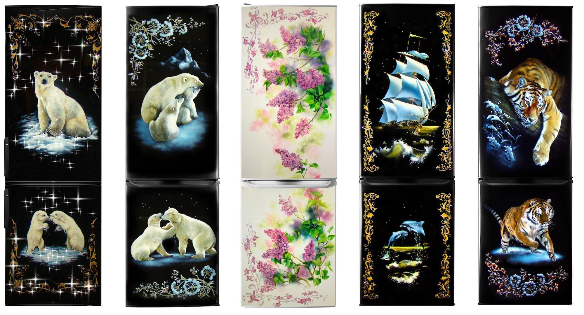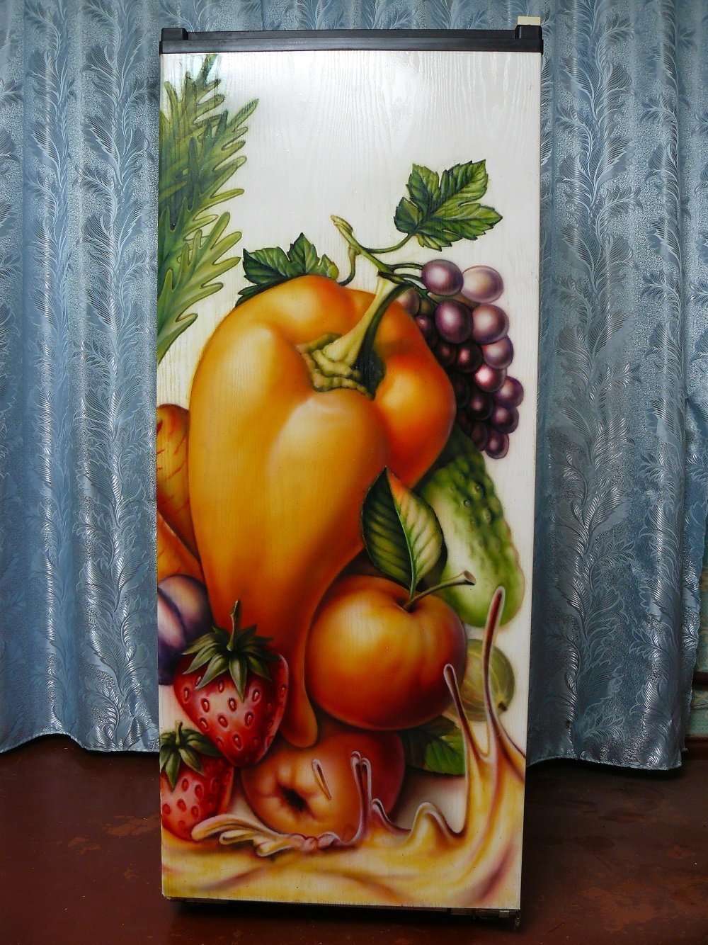 La única regla es, si desea que su obra maestra exista el mayor tiempo posible, elija materiales duraderos y de alta calidad para el trabajo. El refrigerador lleva una carga constante, sus puertas entran en contacto con la humedad y requieren un lavado frecuente. La imagen se desgasta rápidamente, así que no descuide la protección adicional de la imagen aplicada con una capa de barniz transparente.