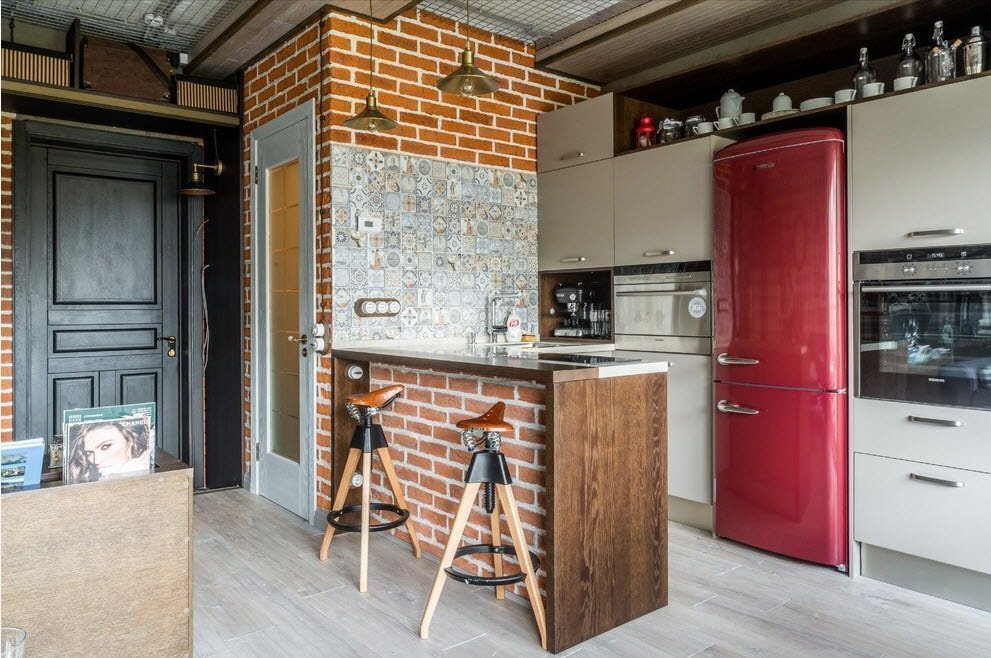 Un lugar enorme que arruina toda la imagen, debido a sus impresionantes dimensiones, puede ser un refrigerador. Durante décadas, el equipo de refrigeración solo estuvo disponible en blanco, sin dejar margen de maniobra para aquellos que desean diversificar el aspecto de la cocina. Solo la última década se caracterizó por la entrada al mercado nacional de modelos en una caja metálica, acabada en madera, en color beige. Los refrigeradores de tonos rojos, marrón vino y café son mucho menos comunes.