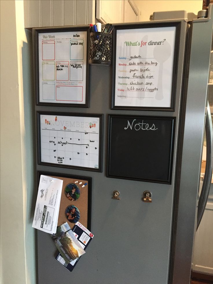 En familias numerosas con muchas preocupaciones diarias, el refrigerador se usa como organizador, una forma de comunicación. En una pizarra magnética puede escribir un buen deseo a los miembros de la familia, recordar asuntos urgentes, hacer una lista de compras, el menú de hoy. Solo anima a todos dibujando una cara graciosa. Los tableros magnéticos producen una variedad de formas, los tamaños pueden ser en miniatura, impresionantes, para los amantes de las letras largas. Para organizar la vida familiar, se adjuntan a la puerta cuadernos con un bolígrafo en un resorte, calendarios desprendibles, pegatinas con recordatorios.
