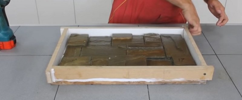 Algunos usan moldes hechos de tablas. Además, cuanto más aspereza y aspereza en sus superficies, mejor. La composición después del vertido repetirá estos defectos, lo que le dará un parecido a una piedra salvaje. No se necesita una muestra con esta técnica.