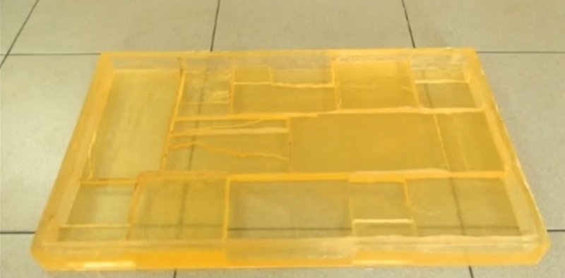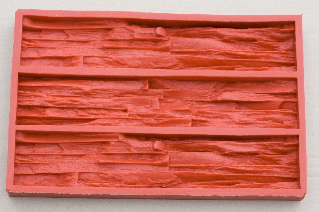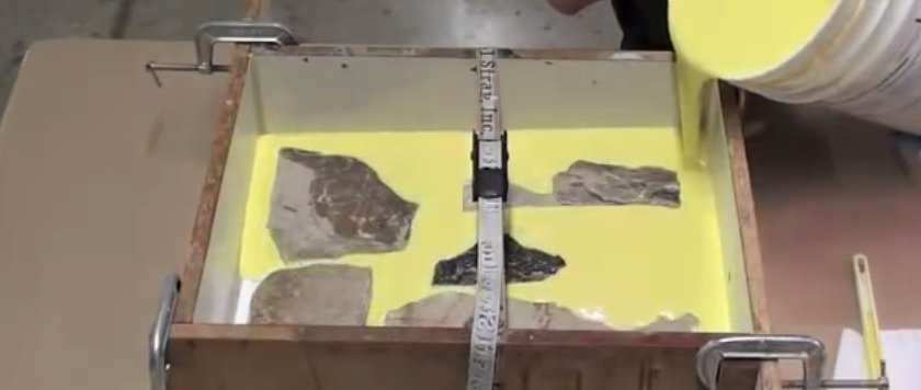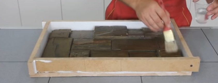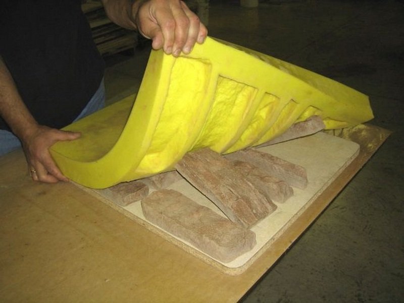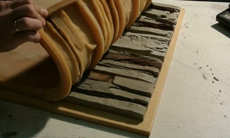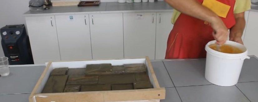 La opción más fácil y económica es el sellador de silicona. Su desventaja significativa es que se seca durante mucho tiempo. Tal material requiere un manejo cuidadoso, ya que se estira bastante rápido y el molde pierde su forma original. En general, la silicona se distingue por el grado de viscosidad. Las formas con un alto nivel de detalle, que no se requieren al crear una piedra, están hechas de composiciones líquidas. La silicona gruesa es ideal para repetir la superficie rugosa y rugosa de una muestra natural. Las piedras se apilan en filas ordenadas en madera contrachapada o una hoja de aglomerado. Es recomendable pegarlos previamente. Luego, cada piedra se recubre con un agente de liberación que evitará que se pegue al molde. Después de eso, el encofrado se construye de MDF o madera contrachapada, que se une a una base plana. Todas las juntas están cuidadosamente selladas. Luego el molde se llena con silicona. Ahora debe dejar que se seque el molde (aproximadamente un día).Después de esto, el encofrado se desmonta y el formulario se separa cuidadosamente de las muestras. Si en algún lugar el molde no cede, entonces se puede ayudar con cuidado con un cuchillo de oficina.