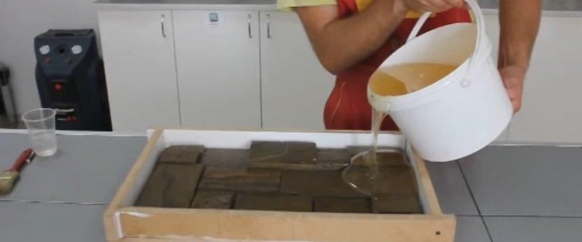 Los moldes compuestos están hechos de la misma manera que la silicona. Por cierto, en la mayoría de las composiciones, él también está presente. Se incluye un kit con un catalizador con la sustancia principal. En un recipiente separado, los dos componentes se mezclan suavemente. No se recomienda batir fuertemente el compuesto, ya que en este caso se forman burbujas, por lo que pueden producirse huecos feos en los guijarros artificiales. Luego, la mezcla se vierte en las muestras, se fija en una pieza de madera contrachapada y se rodea con encofrado. Si la matriz es pequeña, se puede hacer en un balde o tazón grande. Después de la solidificación, las formas se lavan con agua corriente, ya que el olor del compuesto no es agradable.