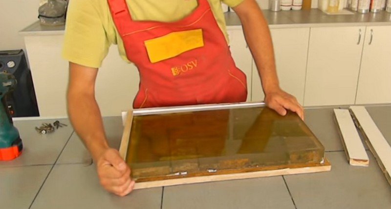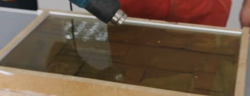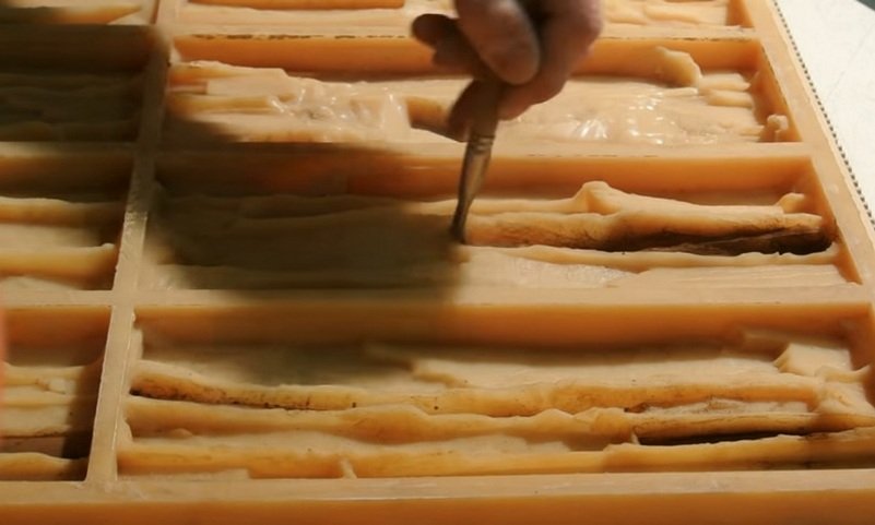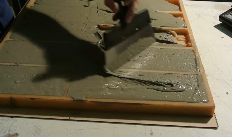 Para evitar la formación de huecos, la silicona se nivela cuidadosamente y se apisona ligeramente con una espátula. Para que la herramienta no se atasque en el líquido endurecedor, se lubrica con aceite sólido o cualquier detergente para lavar platos.