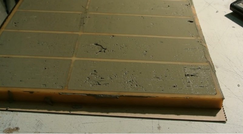 En la siguiente etapa, se coloca una malla de refuerzo en cada forma: simplemente se "ahoga" en solución. Luego, con la misma mezcla o nueva, ya sin tinte (para ahorrar), las preformas se llenan por completo. Cuando el mortero se seca ligeramente y se vuelve más viscoso en su superficie, que se unirá a la pared, se realiza un par de ranuras con un clavo para garantizar una mejor adhesión.