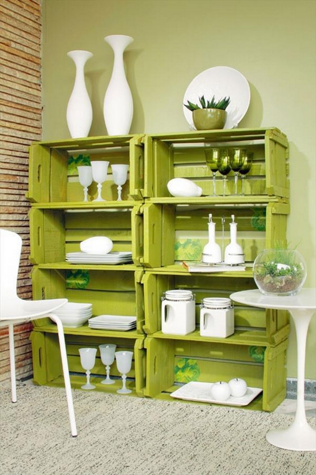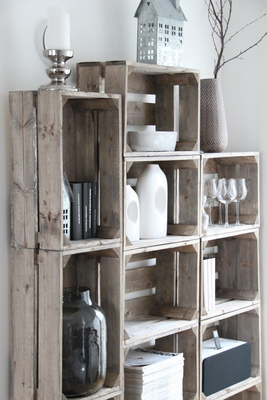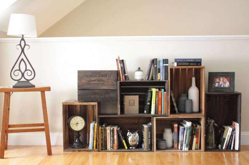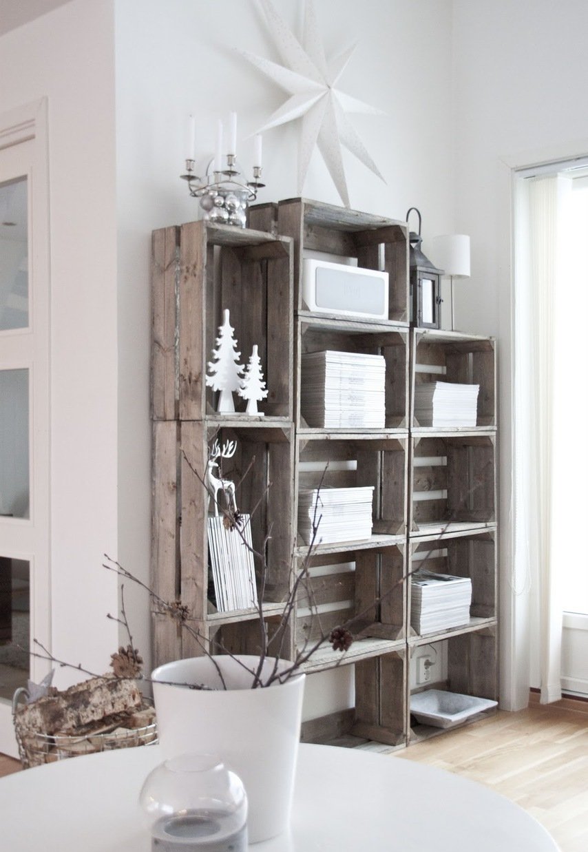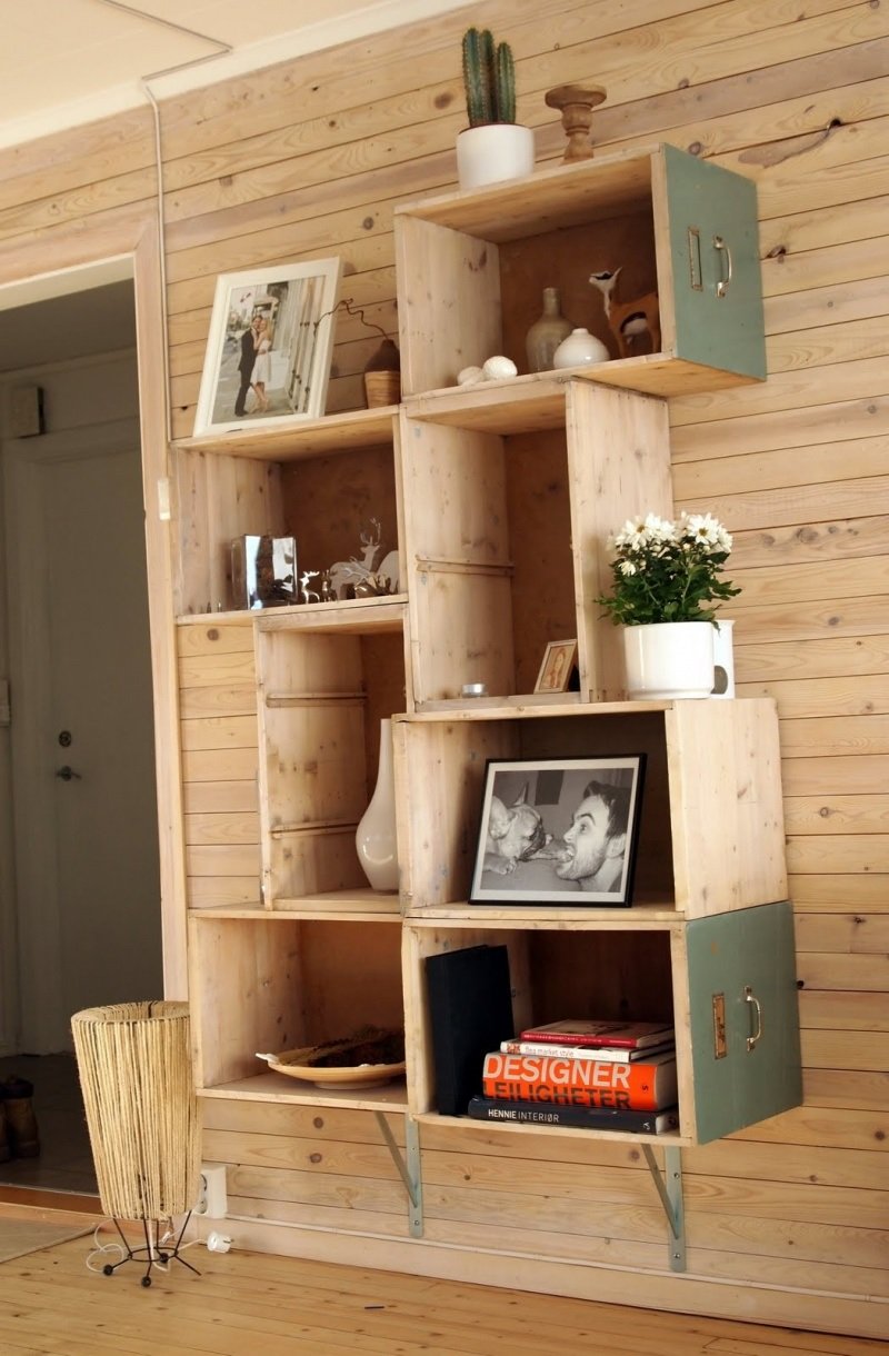 Los estantes de madera serán excelentes estantes. Pueden ser de forma rectangular estricta o tener bordes asimétricos, lo que le dará un toque especial a la decoración de la habitación. Este sistema de almacenamiento es ideal para un taller en el hogar, estudio o sala de estar. Las cajas se fijan entre sí utilizando tornillos o tornillos, pintados y colocados contra la pared. Puede almacenar todo lo que desee en dichos estantes: libros, cosas, joyas, alimentos, toallas y almohadas, productos químicos domésticos, decoración pequeña. Las estructuras originalmente se ven en los estantes donde se colocan cosas "necesarias", alternando con macetas. Los bastidores rectangulares se pueden ensamblar desde los mismos cajones, que están dispuestos en orden estricto o vertical y horizontalmente, pero de tal manera que se forme un sistema de almacenamiento de la forma correcta.
