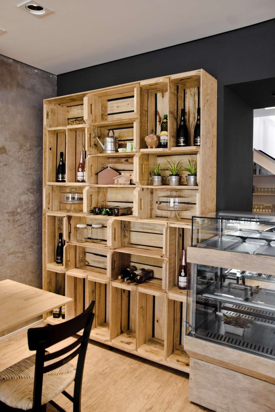 Las cajas de madera se pueden decorar para adaptarse a los estantes originales para almacenar botellas de vino. En el interior, se dividen en secciones con la ayuda de barras transversales, y luego se barnizan, decoran con hilo, piezas de arpillera, se fijan en la pared y colocan un sustrato de heno. El estante temático para almacenar vino está listo. En otra realización, un gabinete abierto está hecho de un cajón. Se coloca verticalmente, la cubierta superior se fortalece con la ayuda de una mesa decorativa de tableros. En el interior, se instalan barras transversales para la colocación horizontal de botellas, como en las bodegas.
