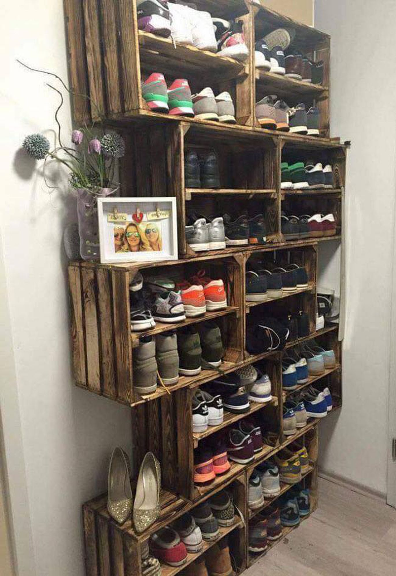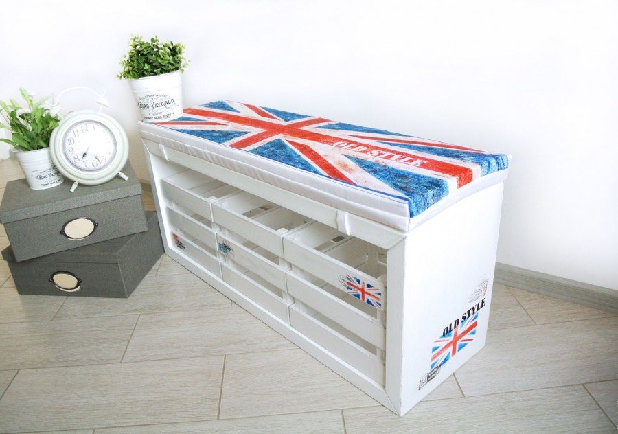 Un gabinete de zapatos se ensambla de la misma manera que un estante para libros. Lo único que vale la pena considerar: las diferentes alturas de zapatillas, zapatos, botines y botas de invierno. Para los dos primeros, los estantes de los cajones dispuestos horizontalmente son adecuados, y debajo de los zapatos altos se colocan verticalmente. Si hace un gabinete hecho en casa con un contenedor viejo, que tiene un color desigual, ese elemento complementará la sala en el estilo provenzal.