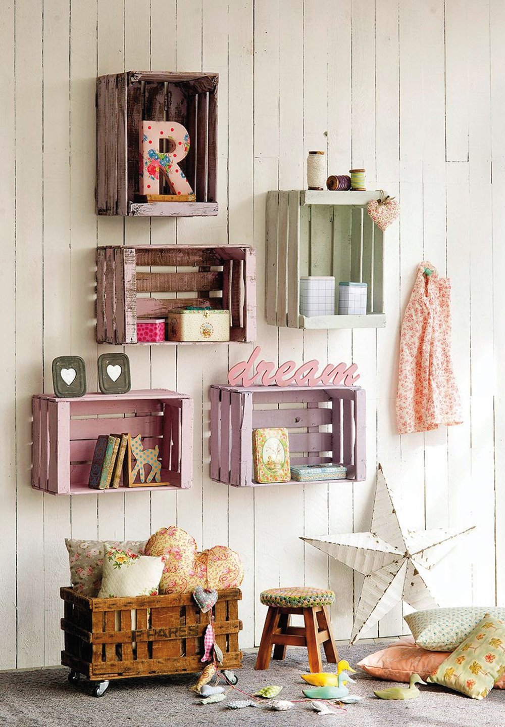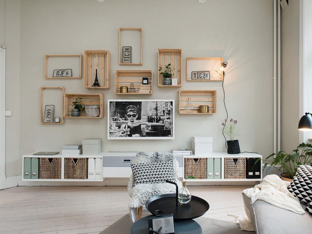 La mayoría de las cajas de bastidor se usan con frecuencia, pero también hay "modelos" de madera contrachapada. Ambas opciones son útiles para decorar una habitación. Se necesita un sistema de almacenamiento montado en la pared en cada hogar. Con la ayuda de estantes con bisagras, puede ahorrar espacio en un baño estrecho, sala de estar, cocina e incluso en la despensa o en la logia. Las cajas de madera para frutas o verduras serán un excelente organizador, lo que ayudará a mantener las cosas y los artículos del hogar en un orden estricto. Después de preprocesar los contenedores, los módulos se unen atornillando los tornillos en sus paredes laterales. Si necesita estantes "individuales" con espacios entre ellos, entonces la escala de trabajo se reduce. Están pintados en el color deseado, decorados y unidos con la cubierta inferior a la pared vertical u horizontalmente. Los lados servirán como estantes. En otra realización, las cajas se colocan "naturalmente", es decir, uno de los lados se apoya contra la superficie. Dichos estantes serán más espaciosos, pero se usan con mayor frecuencia en las despensas, ya que el contenido no se mostrará. Una solución original será la fabricación de un marco de madera en el que las cajas decoradas se colocarán como contenedores extraíbles. Por cierto, de la misma manera puedes organizar estantes colgantes de cestas. Para que el sistema de almacenamiento se vea más hermoso, está decorado con un soporte forjado desde abajo. El metal combina bien con la madera.Una decisión de diseño inusual será el diseño de la pared en el pasillo con la ayuda de cajones de diferentes tamaños. El centro de la composición será un espejo en un marco de madera. A su alrededor se colocan cajas de diferentes tamaños: algunas se usan como llaveros, en otras se colocan sombreros y guantes, y en la tercera, plantas de interior y decoración pequeña. Complete el diseño fijando el estante con ganchos para bolsas.