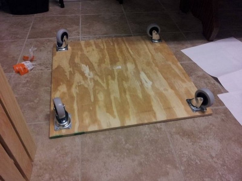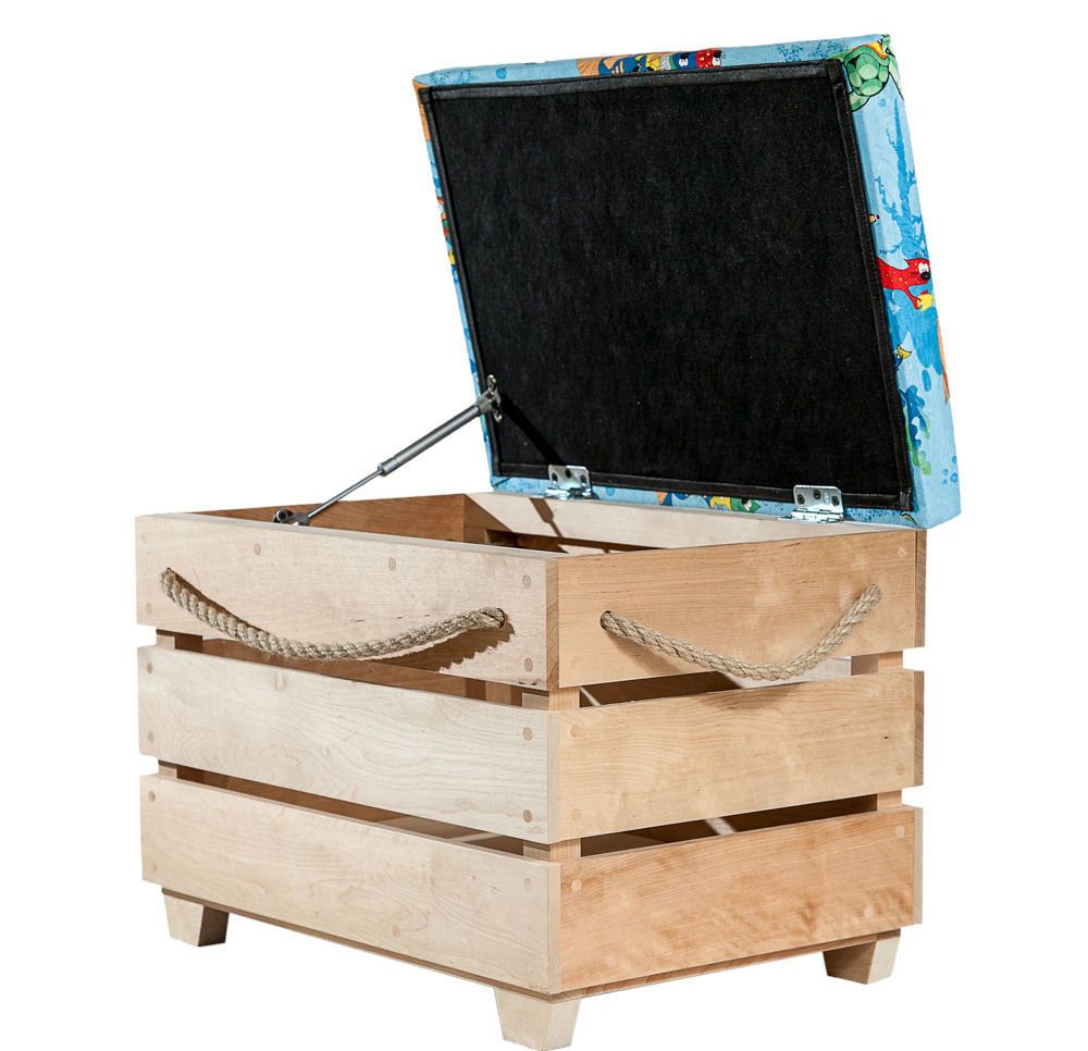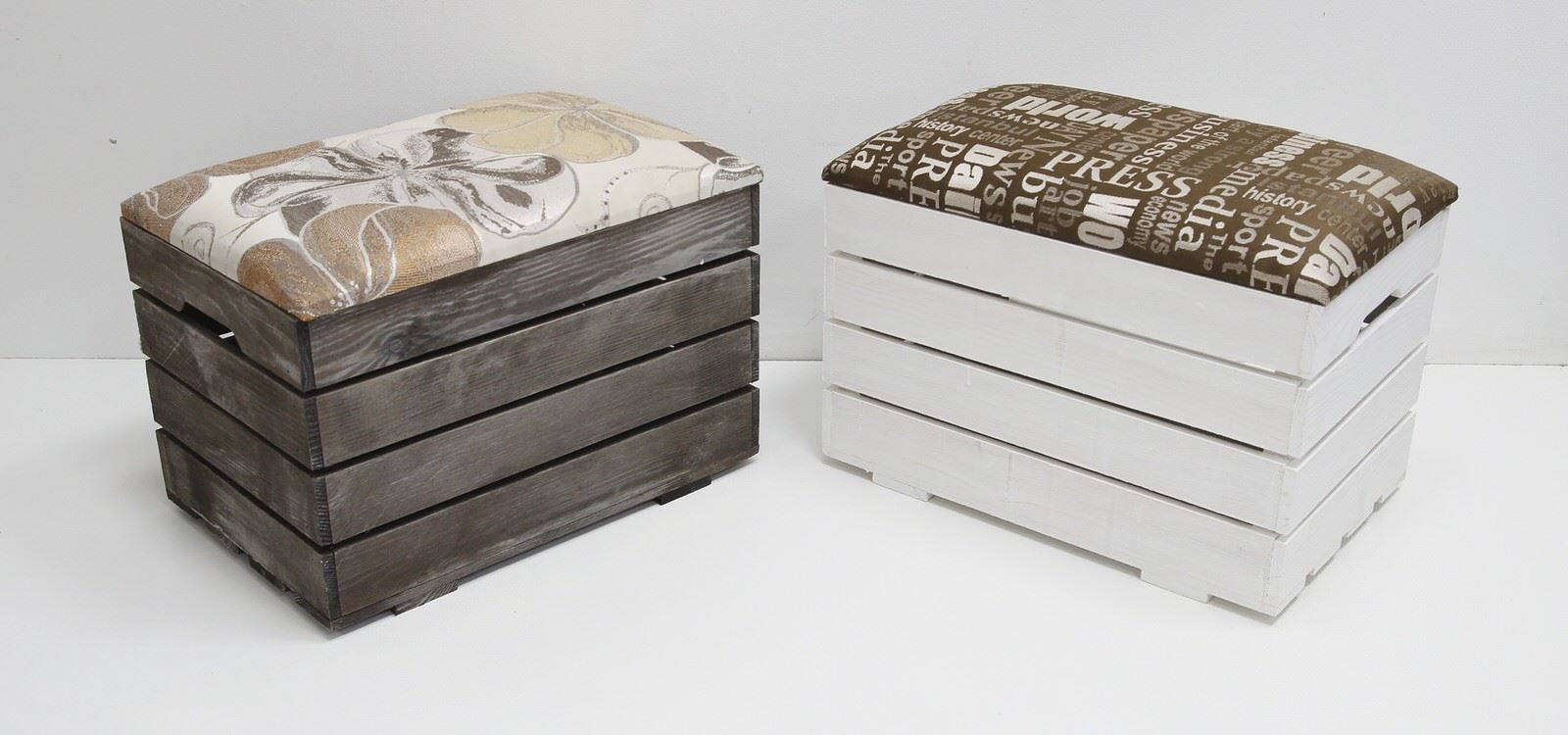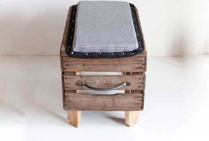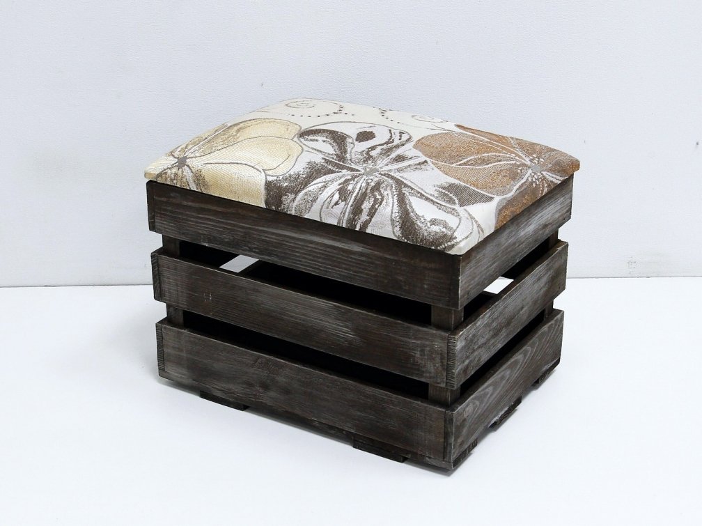 La caja está lijada y barnizada. Las ruedas están unidas a su parte inferior y la cubierta está fijada en la parte superior. Si desea utilizar la otomana también como un sistema de almacenamiento, se coloca con bisagras para que el asiento se pueda abrir más tarde. Luego, la gomaespuma se fija en la tapa y se tapiza con materia usando una grapadora.