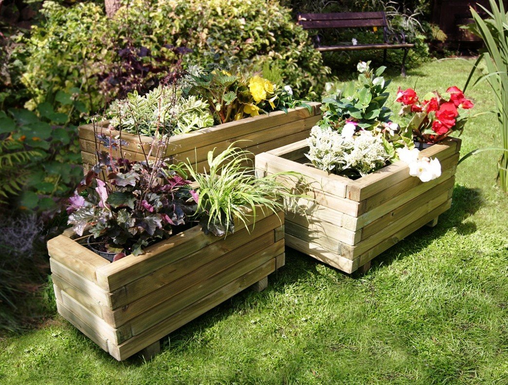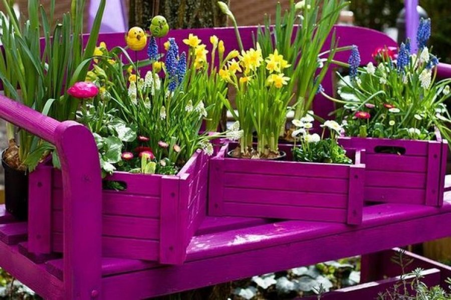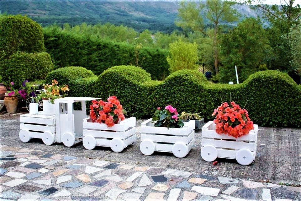 De los maceteros resultan excelentes macizos de flores. Simplemente se pueden poner sobre un sustrato, creando una composición original en frente de la casa, o se pueden combinar en una cama de flores vertical con varios pisos. Las cajas en desorden caótico se apilan una encima de la otra, conectadas paralelamente por tornillos autorroscantes para obtener una estructura estable. En versiones más complejas, se utilizan cuatro rieles, fijados por pares en ángulo entre sí. En lugar de escalones, se colocan cajas con flores o hierbas en esta “escalera de tijera”. Si hay una pared libre de un edificio anexo o una valla de madera, entonces los módulos se fijan en ella, de la manera de estantes en los que colocan macetas con plantas. La versión original será una composición de cinco cajas, cuatro de las cuales forman los lados del rectángulo, y la quinta se convertirá en el centro en contacto con los otros módulos en las esquinas. Si hay disponible un contenedor de diferentes tamaños, entonces se hace un macizo de flores de varios niveles. Se coloca una caja grande en la parte inferior y se colocan módulos más pequeños en la parte superior para que el más pequeño se convierta en la parte superior de la pirámide. La alternancia "rombo cuadrado" se verá hermosa en esta composición. Además, las camas de jardín, las locomotoras están hechas de cajones, donde los módulos están equipados con ruedas decorativas y se convierten en remolques, y el frente se convertirá en la "cabeza del tren".