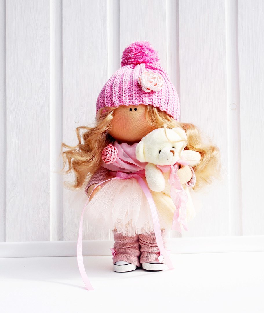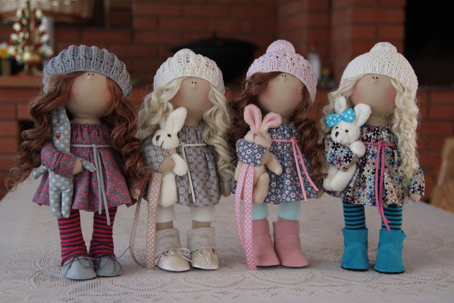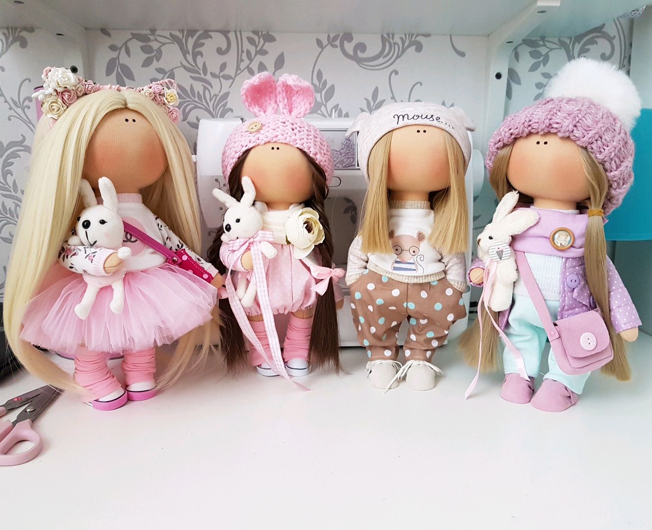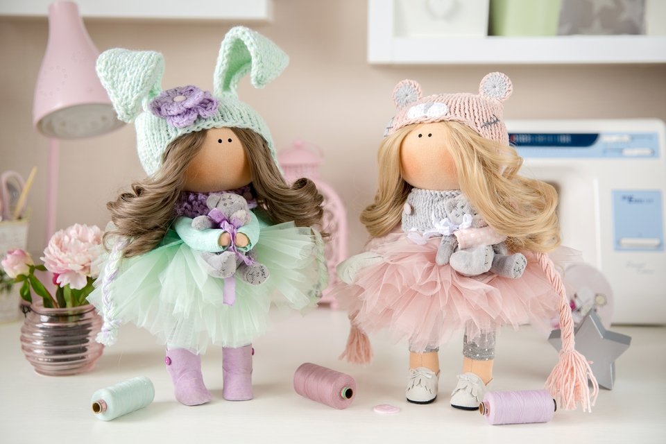 Para el trabajo, necesitará hilos, una aguja, tela, pinturas de tela, cuentas grandes, ropa de invierno sintética, ropa para muñecas, zapatos. Al principio, el patrón se dibuja en papel, después de que todos los detalles están encerrados en un círculo en la tela: la cabeza y el cuerpo en dos piezas, los brazos y las piernas en cuatro. Todas las partes están cosidas, dobladas, rellenas con un acondicionador de invierno sintético, conectadas entre sí, se destacan las orejas y los dedos. Las articulaciones de la muñeca serán cuentas grandes, y la cara se dibuja con acrílicos. El cabello se compra especial, muñeca o cosido, se pueden colocar en un peinado elegante. La ropa y los zapatos se cosen independientemente o se compran.