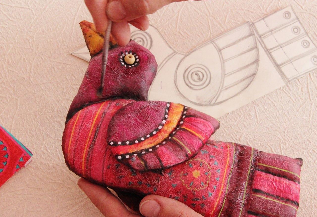 Pero aquí está cómo hacer un trapo de urraca con elementos de decoupage y pintura acrílica. Lo que necesita: tela, servilletas de colores para decoupage, pincel, botones, pegamento, soporte de hierro, aguja e hilo. Primero, se dibuja un patrón en papel. Una urraca constará de dos partes idénticas: un patrón de papel está rodeado por una tela doblemente doblada. Luego, los detalles (cuerpo y alas) se cosen en una máquina de escribir, retorcidos, rellenos. Las alas están cosidas o pegadas al cuerpo. Luego, el ave se imprima con pegamento PVA, se seca con un secador de pelo, se pinta con acrílico o se decora con servilletas. Los ojos están hechos de cuentas o botones, el soporte está pegado con servilletas.