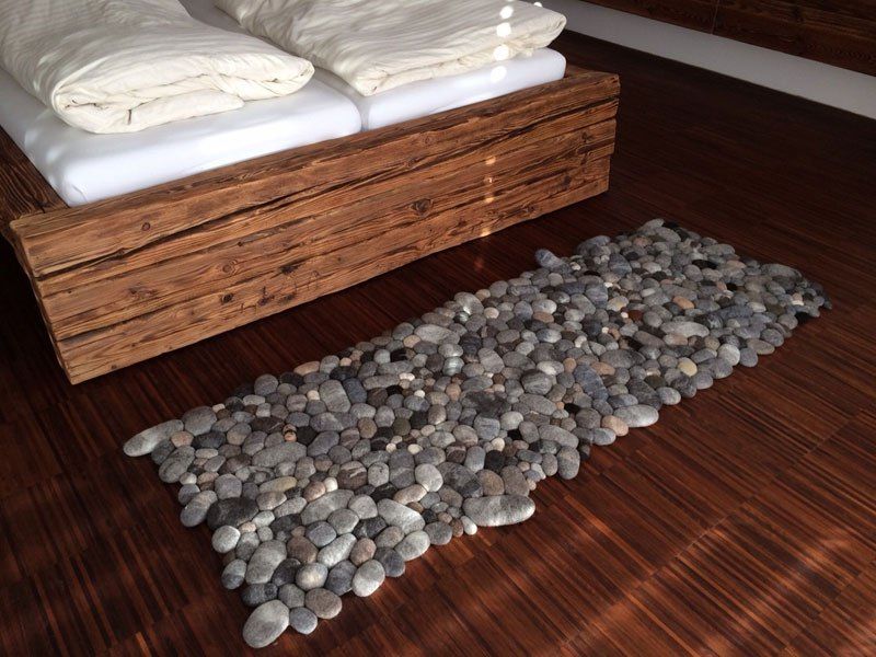 Para un hall de entrada, un baño, es útil una alfombra original hecha de piedras planas o redondas y piedras de mar. Usando una pistola de pegamento, las piedras de colores se pegan en un pedazo de alfombra o linóleo. Son preferibles al mismo tamaño, y se seleccionan piedras de varios tamaños para la alfombra "curativa". Si hay un guijarro de varios colores, entonces se presentan patrones, figuras de animales, inscripciones y figuras geométricas. Tal alfombra incluso puede ser hecha por un niño-colegial. Se pueden hacer alfombras similares con corchos de vino, tapas de plástico multicolores para bebidas.