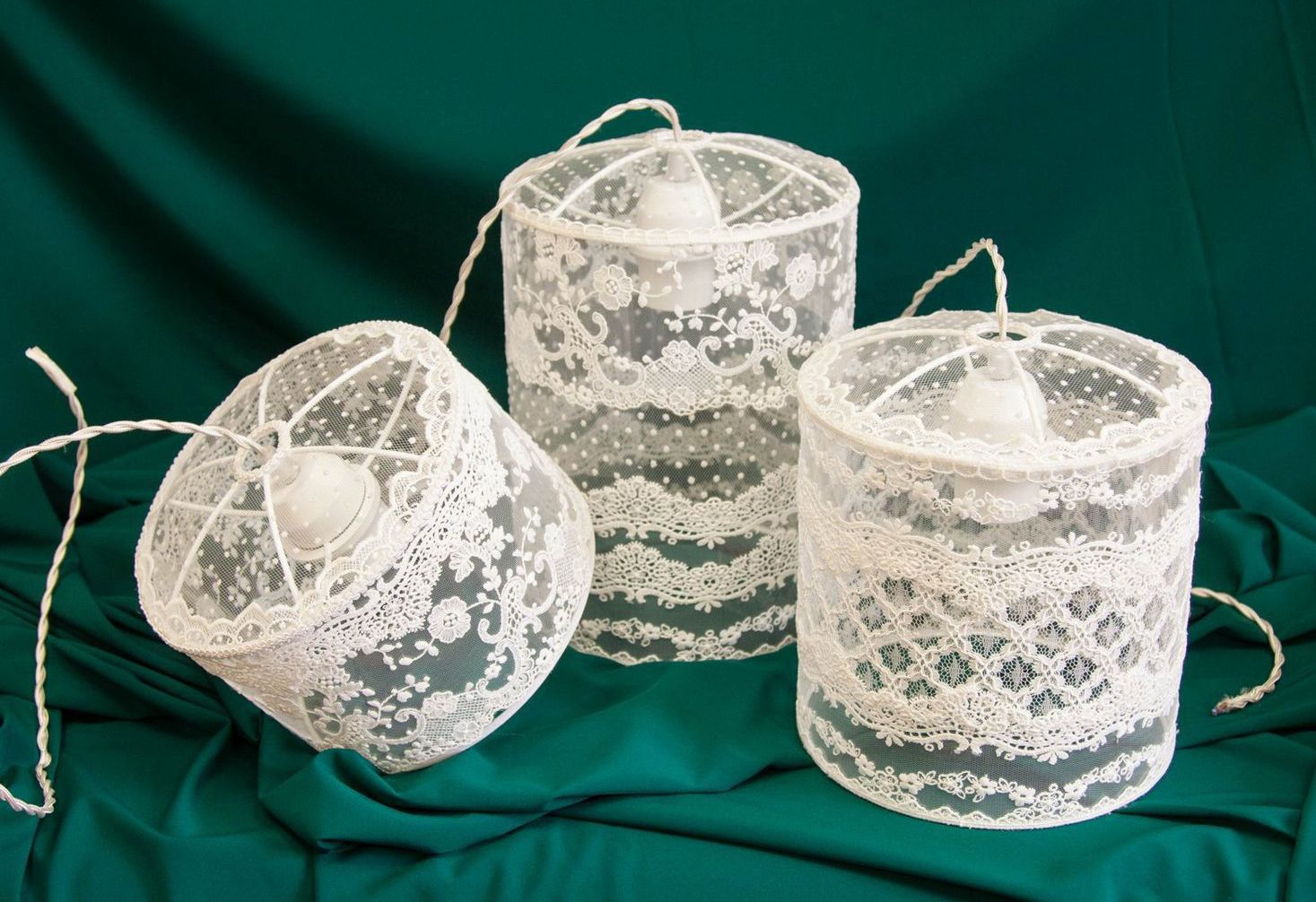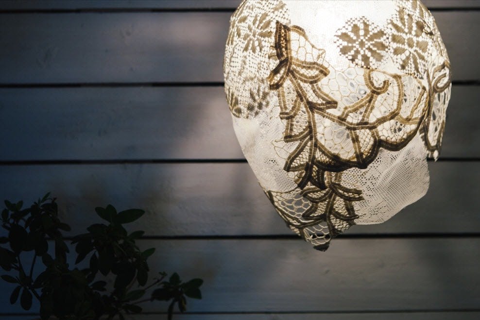 El encaje blanco con manchas es fácil de hacer vintage al sostener un poco en té fuerte o infusión de cáscaras de cebolla. Los patrones de punto y guipur en los candelabros de faroles "japoneses" proyectan hermosas sombras en paredes y techos.