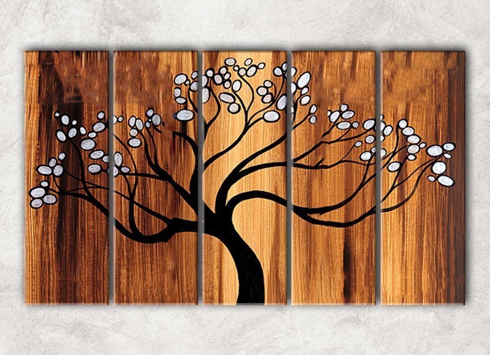 pegando ramas de madera en forma de árbol en la superficie de una tabla, seguido de la aplicación de pinturas, barnices.