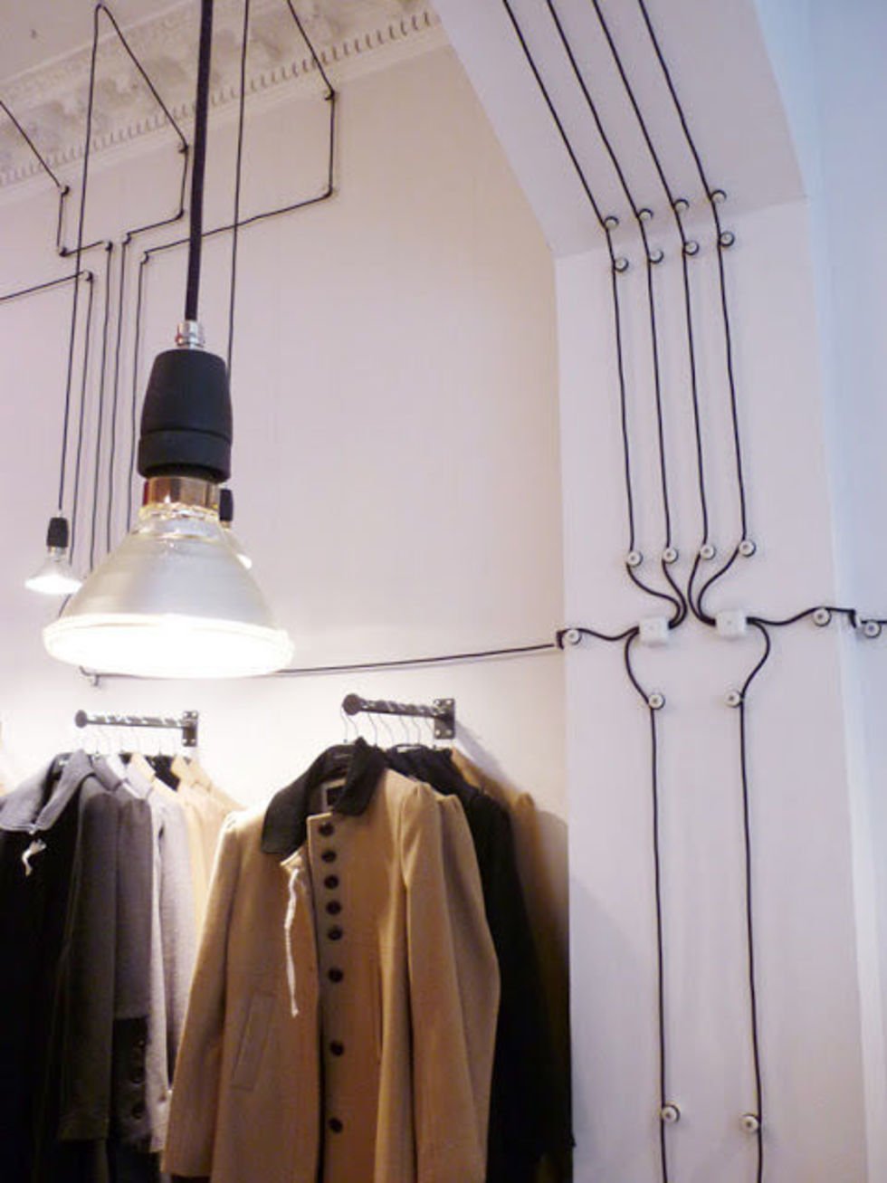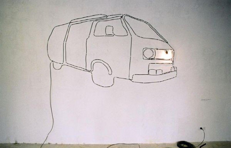Puede estar funcionando un cable largo: en un extremo hay un enchufe que está enchufado a una toma de corriente, y en el otro hay una lámpara de techo, aplique. Los cables en este caso se fijan con soportes especiales. Desde un encaje negro de una lámpara de mesa, se coloca un marco rizado para fotografías sobre la mesa. Un automóvil está representado en una pared de color contrastante con un cable blanco; luego, dos o cuatro focos se ubicarán al final del cable. Si el encaje es verde, contra el fondo de la pared blanca se despliega el paisaje de Año Nuevo: un árbol de Navidad con luces de colores en los extremos de las ramas. Además, con la ayuda de cables, puedes enmascarar artilugios espías geniales.