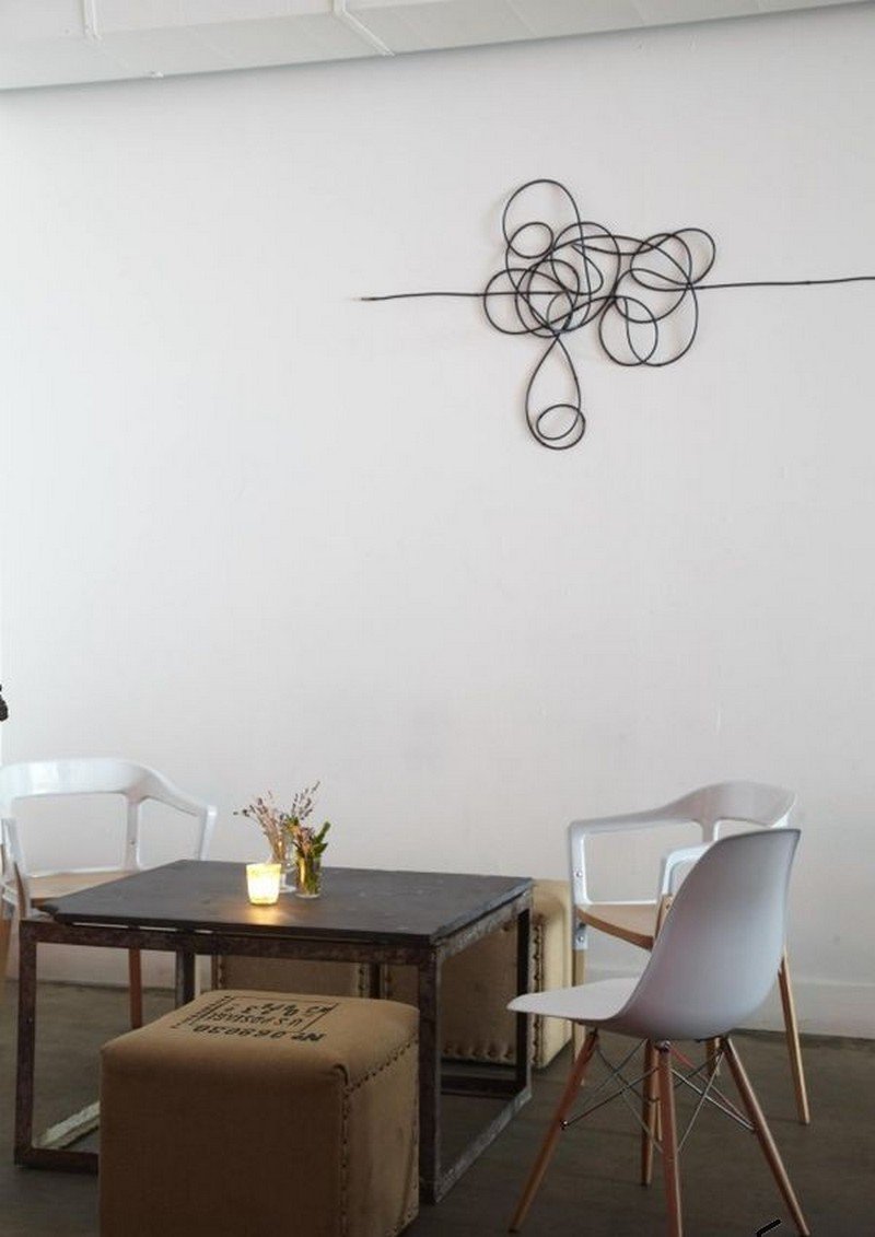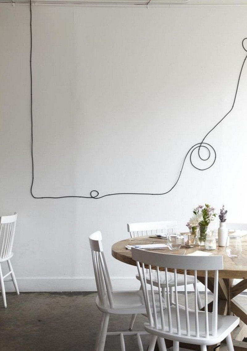 Después de la reparación, quedaban unos pocos metros del cable de alimentación negro. Se puede utilizar en decoración de paredes.Si dibuja un panorama de la ciudad en la pared y luego clava o pega el cable a lo largo del contorno, obtendrá una decoración original para el color claro de la pared. Al mismo tiempo, los focos se encuentran en la pared: ventanas de los edificios de la ciudad. Tal composición es adecuada para un diseño de oficina aburrido.