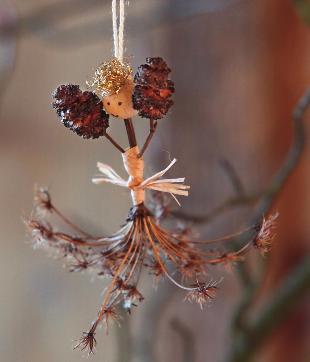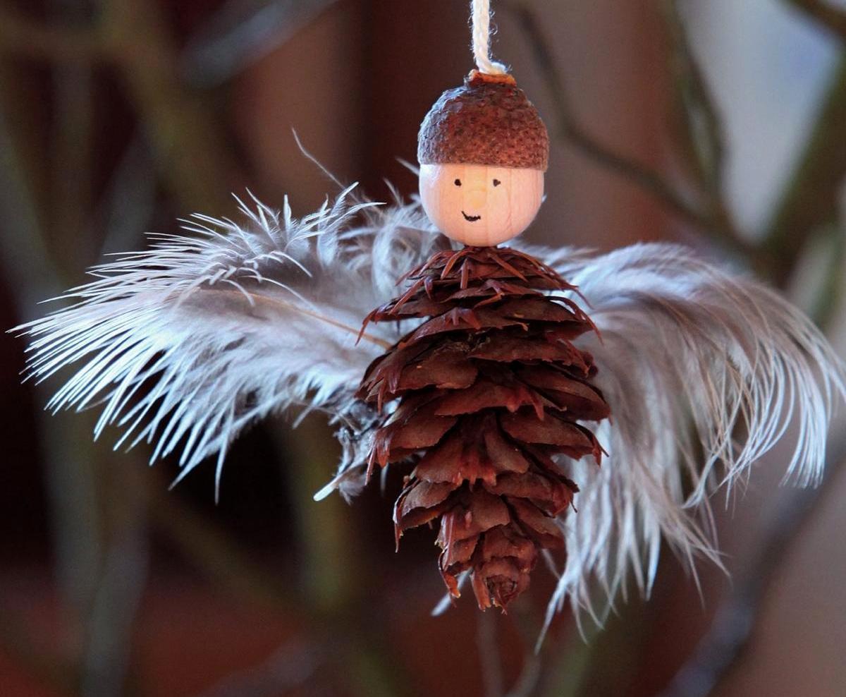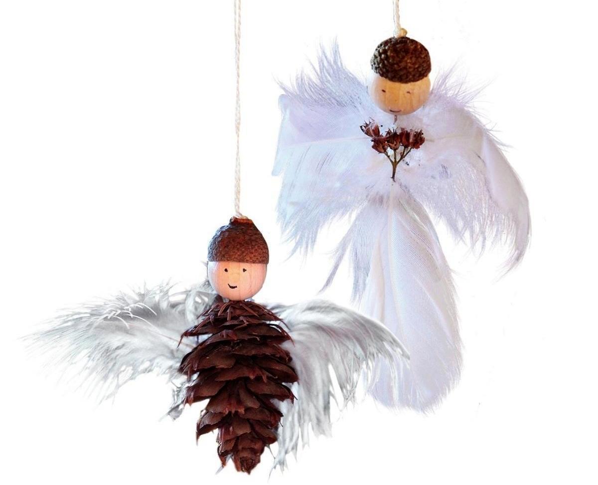 Para manualidades, necesita hermosos conos lisos, una cinta, piezas de fieltro y bolas de madera y plástico. Para que la base natural no pierda forma debido a un cambio de temperatura, el cono puede bajarse durante unos segundos en un recipiente con pegamento para carpintería. Después del secado, no perderá forma y siempre estará cerrado. El siguiente taller te ayudará a crear simples figuras de ángeles: