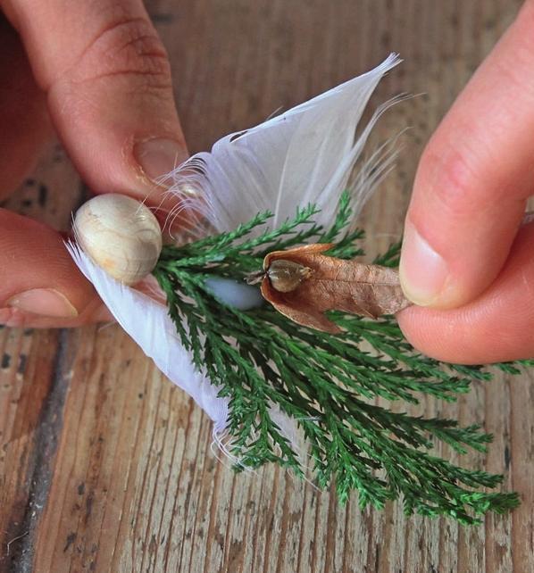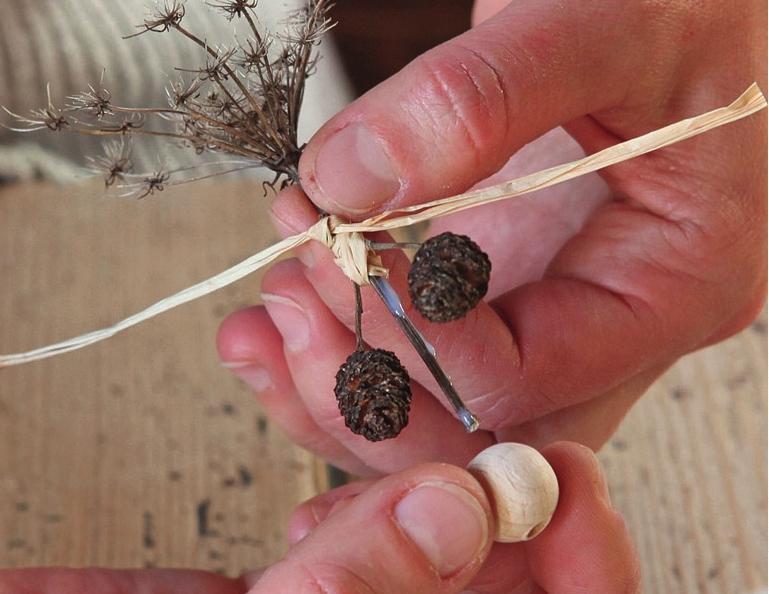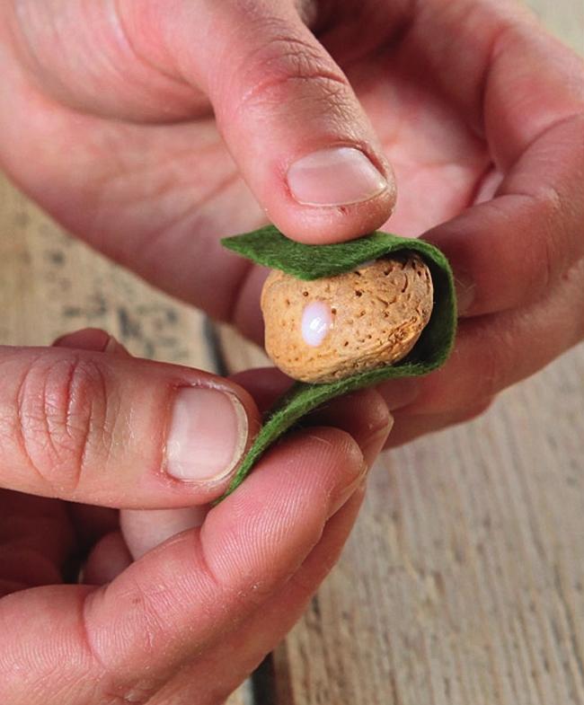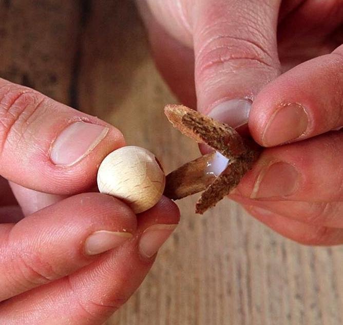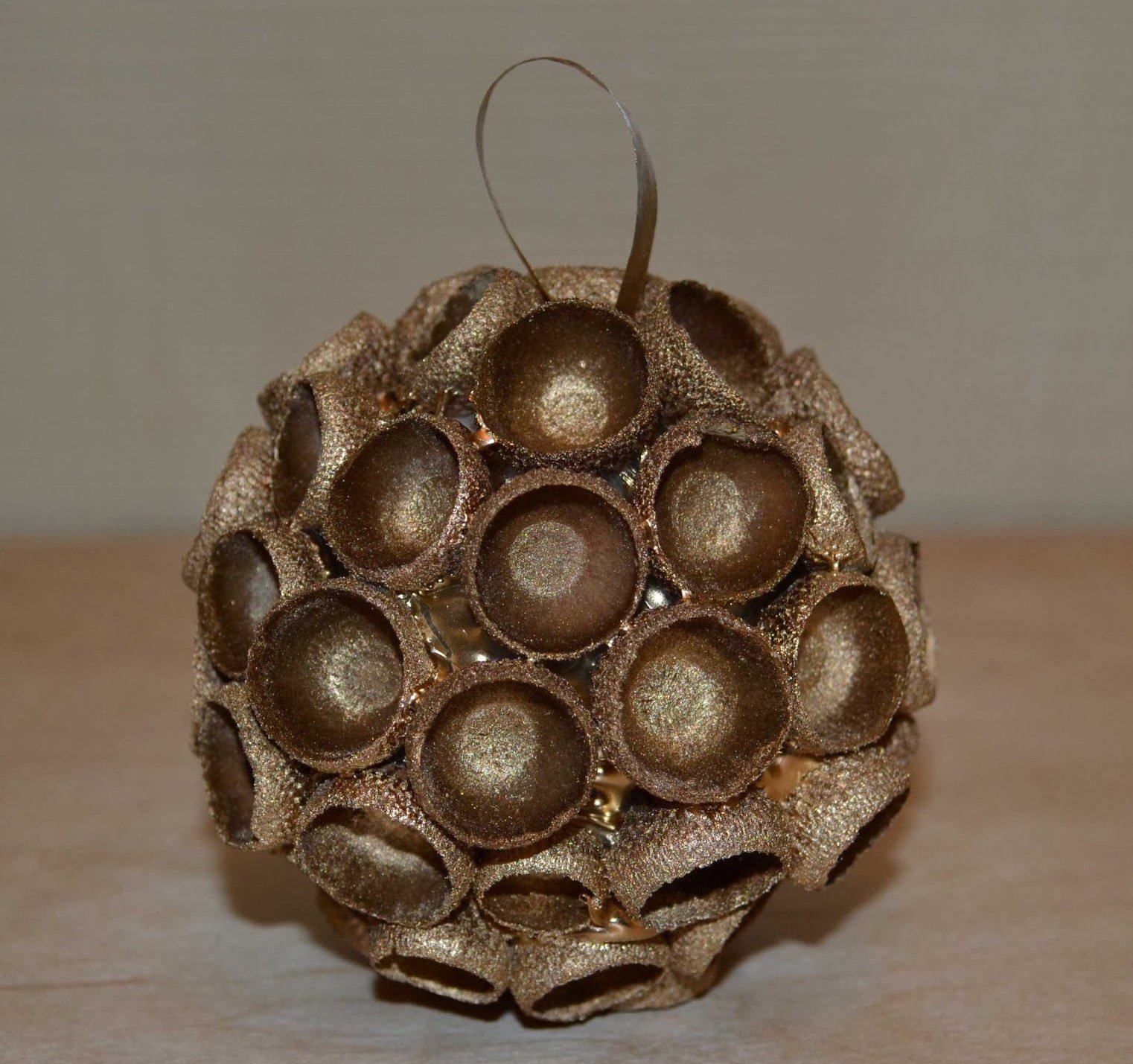 Pintamos el núcleo preparado en marrón y pegamos los sombreros con colas a la pelota. Llena el espacio lo más apretado posible. El lugar de un elemento hueco se tomará mediante un gancho de fijación de un alambre. Puedes decorar un juguete con pegamento de silicato y destellos, hermosas cuentas dentro de sombreros, cintas.