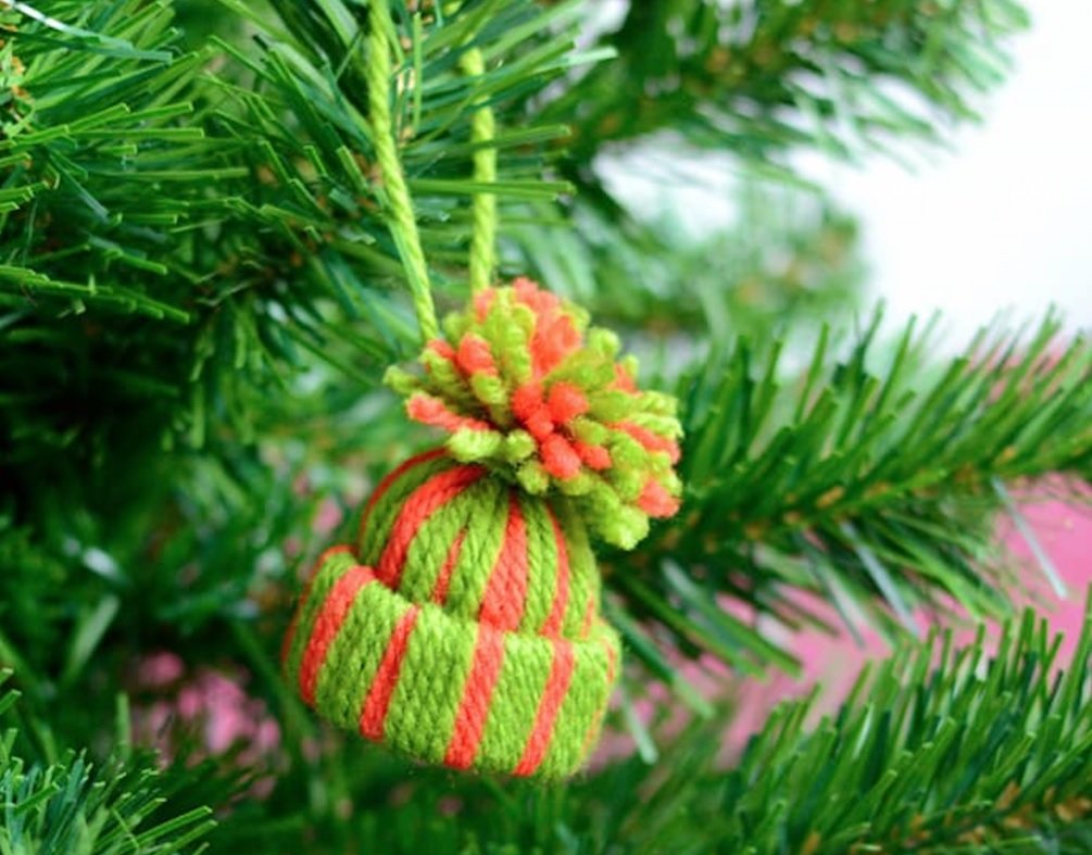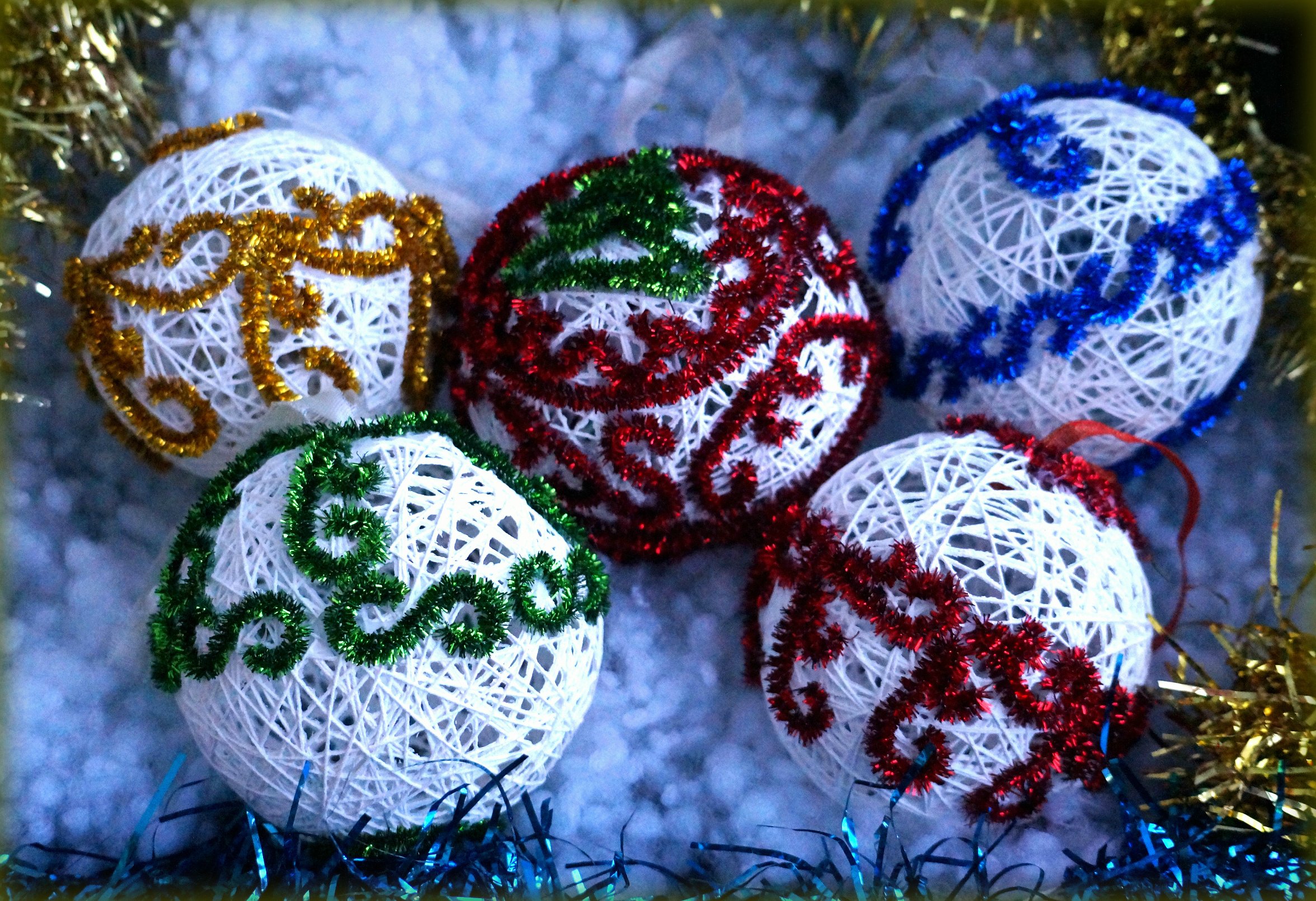 A partir de hilos de lana comunes, puedes crear juguetes de malla redonda para el árbol de Navidad. Para el trabajo, necesitará globos pequeños, hilos y pegamento PVA. Inflamos una bola de un tamaño adecuado y atamos su cola con el extremo del hilo. Comenzando desde el mismo borde, envolvemos la forma firmemente y en orden aleatorio. Los hilos de hilo no deben estar cerca uno del otro.