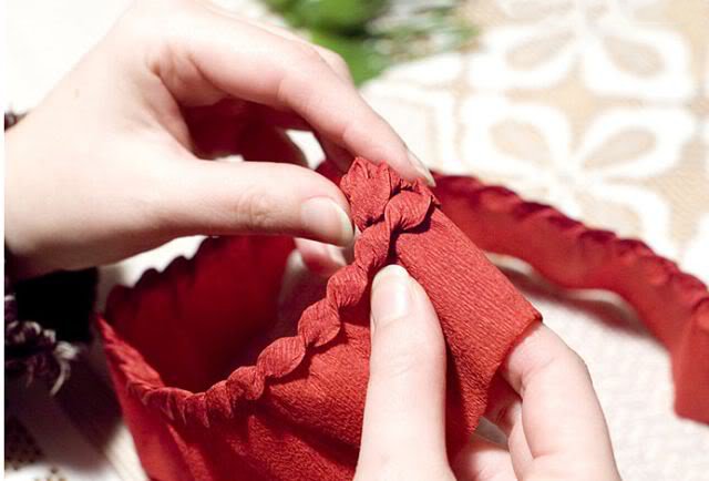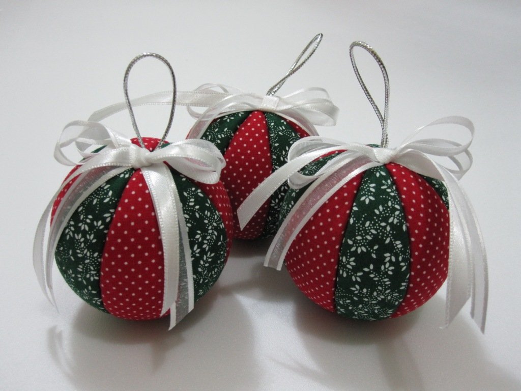 Los rectángulos de tela preparados deben aplicarse uniformemente a las rodajas y ocultar sus bordes en las ranuras. Puede empujar el material con cualquier objeto plano. Después de completar todos los sectores, puede proceder a la decoración. Escondemos las costuras debajo de la cinta o trenza, envolviendo la bola diagonalmente alrededor del material. De los restos del cordón formamos un bucle.