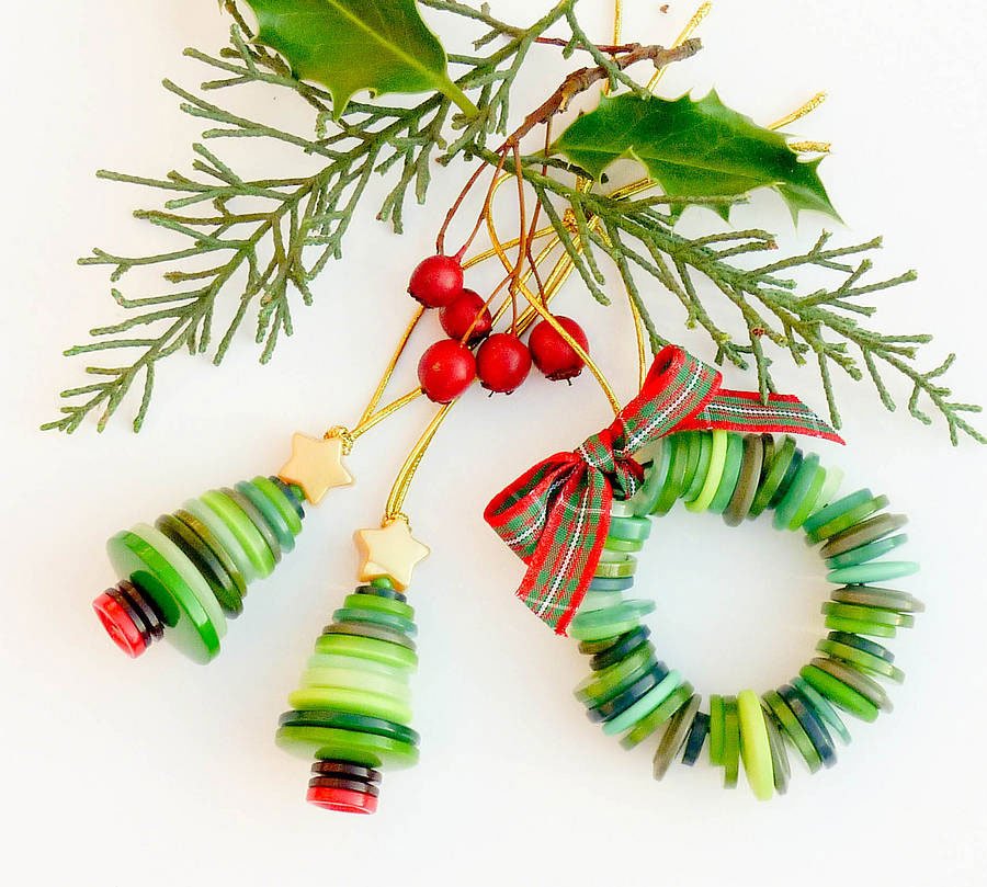 Los diseños de botones originales complementan el tema de Año Nuevo. Puedes hacer una manualidad de cualquier forma, pero es mejor comenzar con un simple árbol de Navidad. Para el trabajo, necesitará botones multicolores de cualquier tamaño, una hoja de cartón. Puede sujetar elementos con una pistola de pegamento o alfileres de costura.