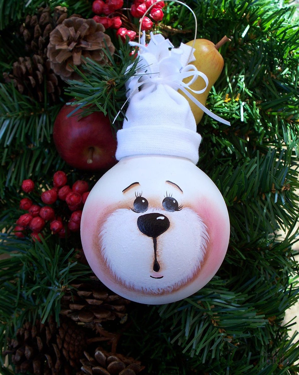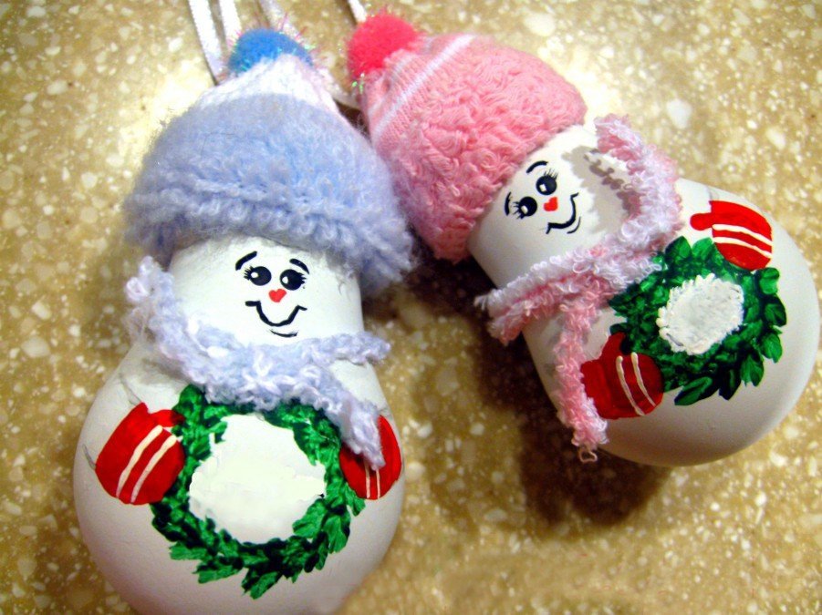 La base del muñeco de nieve será una simple bombilla. Antes de su uso, debe pintarse de blanco. Es mejor usar un trozo de esponja o espuma para evitar las tiras restantes y los trazos irregulares. Para hacer que el recubrimiento sea más denso, la pintura debe aplicarse repetidamente. De una pieza de tejido de punto hacemos un sombrero. Para la decoración, puede usar un pompón o simplemente una cinta brillante.