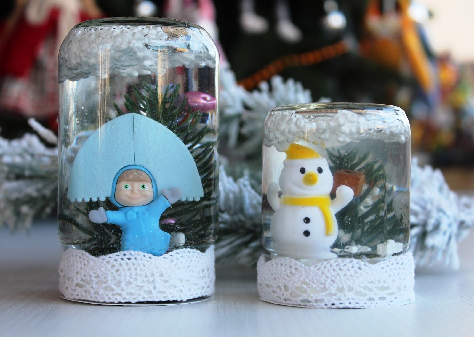 Antes de comenzar, debes crear una composición. Pueden ser juguetes individuales de Kinder, productos de tela, plástico y otras bagatelas. Pegamos las partes con pegamento impermeable en el interior de la tapa y lo llenamos con una mezcla de agua y glicerina. Luego nos dormimos los destellos y giramos bien la tapa. Cuanto más anticongelante, más lenta se hundirá la nieve imaginaria en el fondo del frasco. El toque final es el procesamiento conjunto con pegamento.
