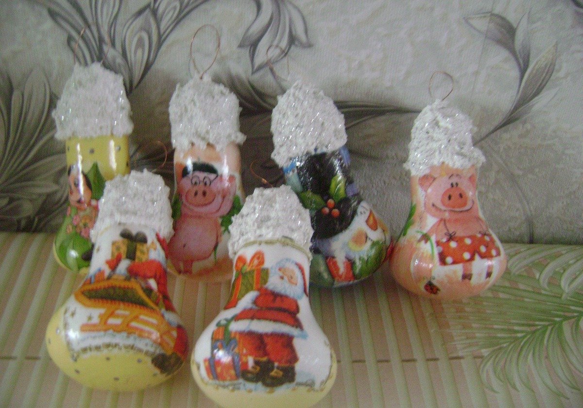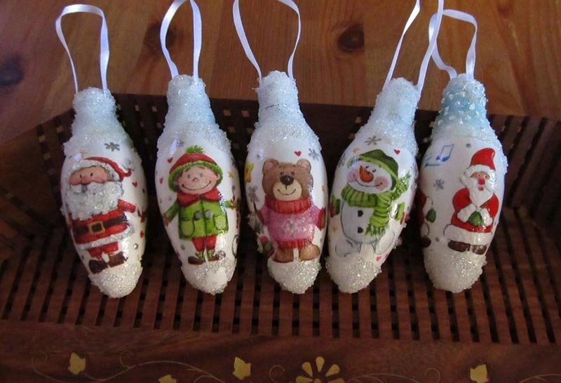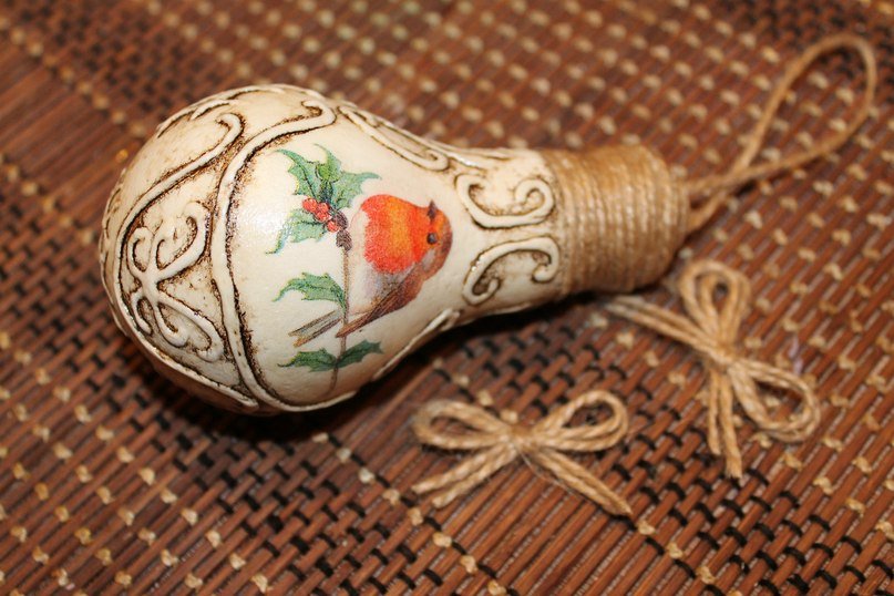 Para la decoración con la técnica de decoupage, necesitará una servilleta especial con una imagen, una fotografía en una hoja delgada, tiras de música, trozos de periódico u otros elementos de papel. Primero, la bombilla debe limpiarse con alcohol y pintarse del color que desee. Después de que la pieza de trabajo esté completamente seca, cortamos los patrones de la servilleta y la pegamos a la bombilla.Los bordes deben estar bien extendidos y aplastados con una toalla seca. Para agregar brillo y proteger el recubrimiento de factores externos, puede usar una capa delgada de barniz incoloro.
