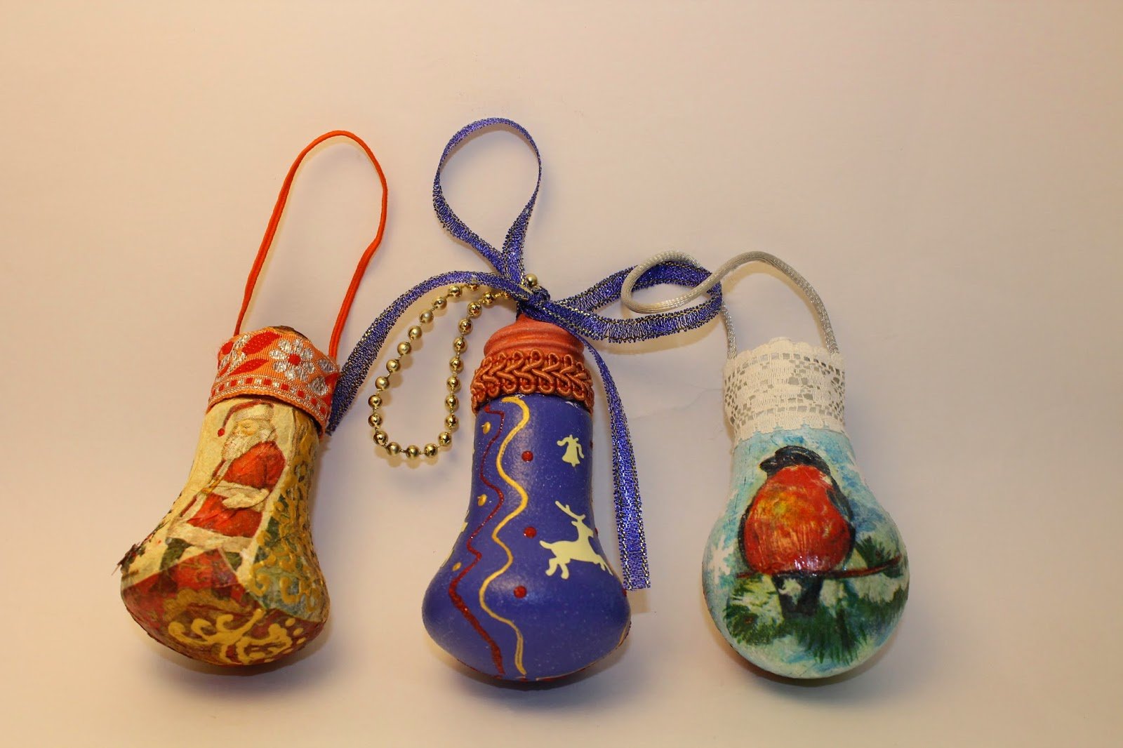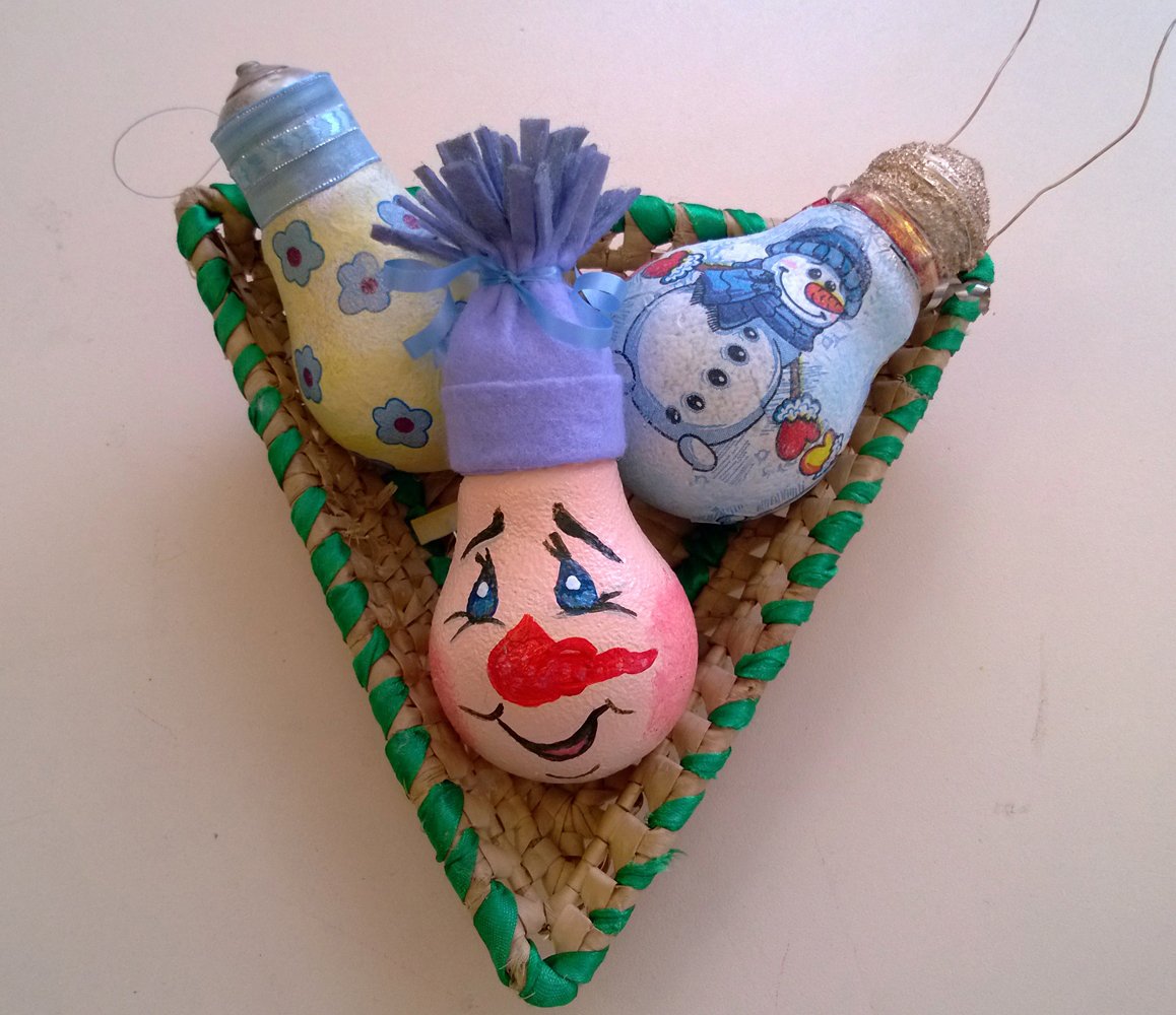 Crear juguetes originales a partir de material de desecho, como bombillas fundidas, tiene muchas ventajas. Este es un ahorro significativo en joyería tradicional, la capacidad de crear un diseño original para la belleza del Año Nuevo. Simplemente puede pintar una bombilla de cualquier color o crear interesantes juguetes de árbol de Navidad rizados.