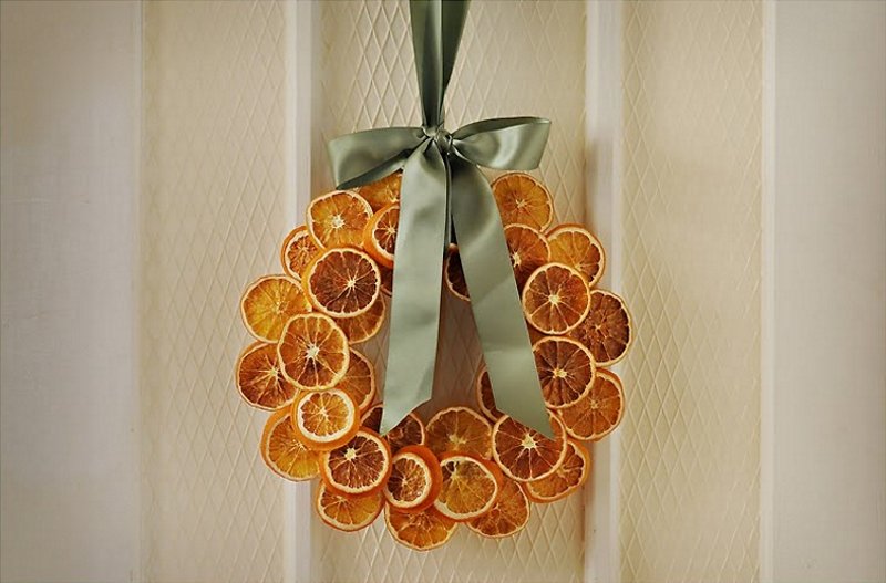 Guirnaldas de naranja. A través de la fruta, es necesario pasar un alambre de metal y torcer sus extremos en forma de caracol. Atamos una hermosa cinta a un extremo y la colgamos en un árbol de Navidad. Puede dejarlos con un aspecto natural o cortar rayas espirales, cualquier patrón;