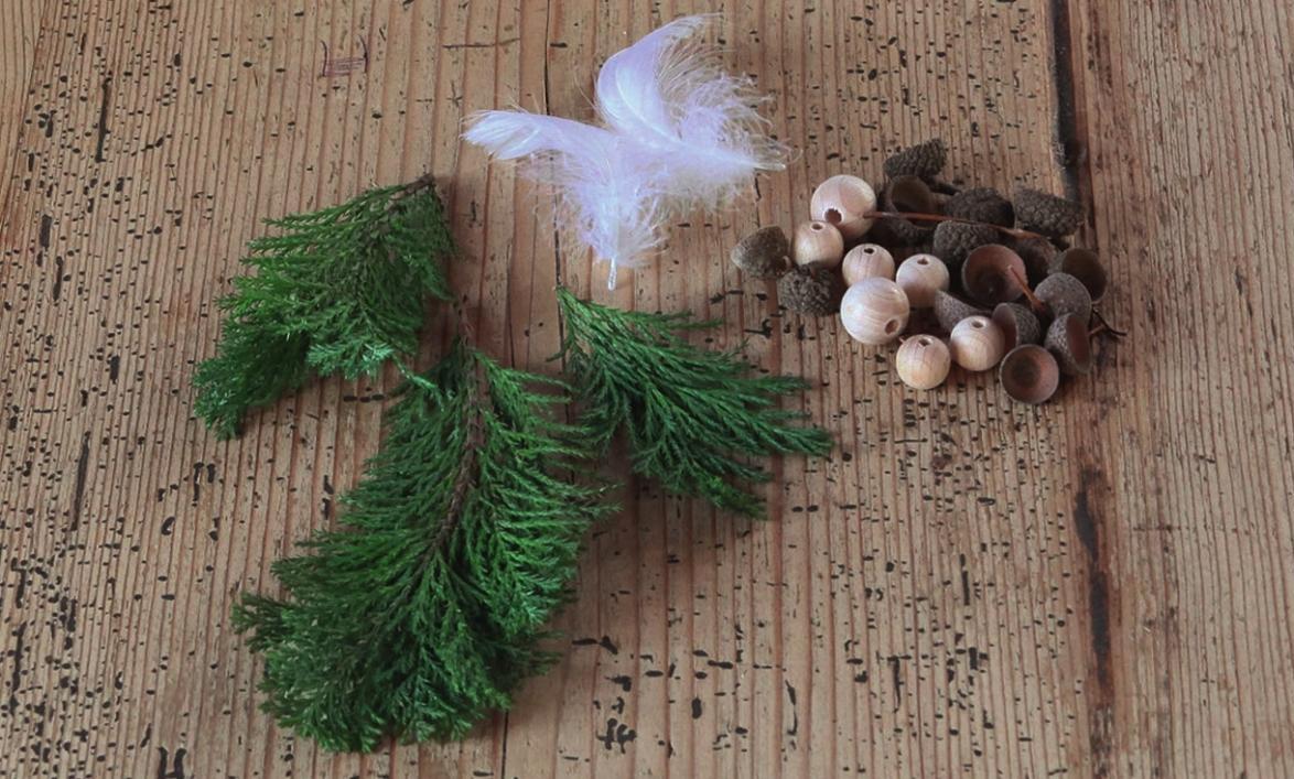 Los sombreros enteros de bellotas serán útiles para crear una interesante bola navideña en un estilo ecológico moderno. Tal artículo se transfiere mentalmente a la espesura del bosque de invierno y hace creer en un verdadero milagro. La base del juguete será una espuma en blanco. Puede comprar dicho artículo en cualquier tienda de costura.