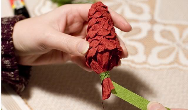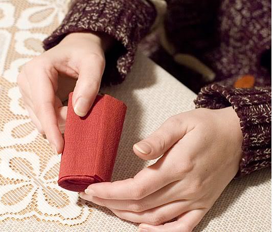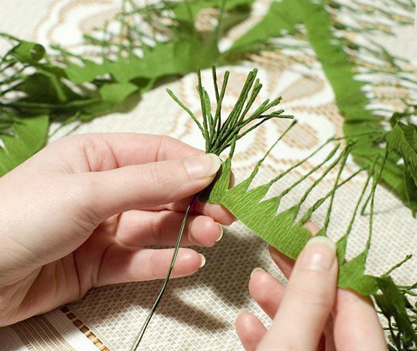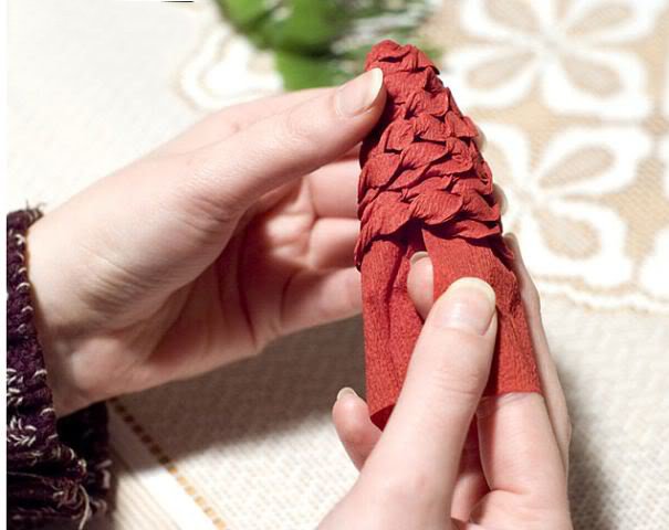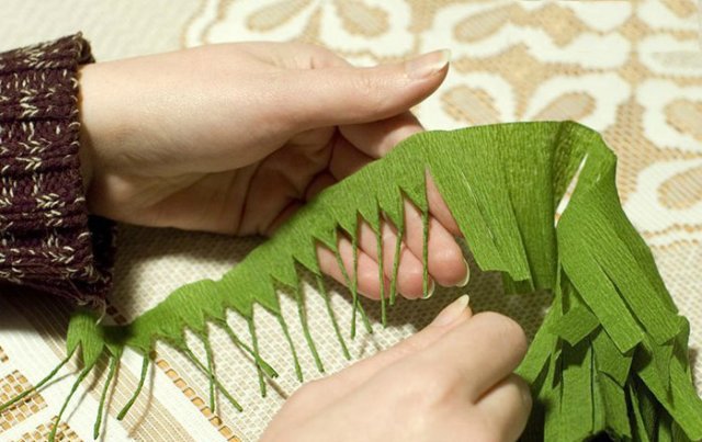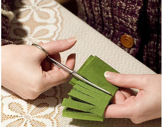 Golpe en la base con escamas triangulares. Como marco, puede usar espuma o papel. Pega un círculo a la parte superior. Mientras la pieza de trabajo se seca, proceda a la fabricación de escamas. Los haremos en la técnica de origami modular. Cortamos cuadrados de papel de color: 2 cm, doblamos dos extremos hacia el centro. Ahora sujetamos todos los elementos en un círculo en un patrón de tablero de ajedrez a la parte superior redonda.