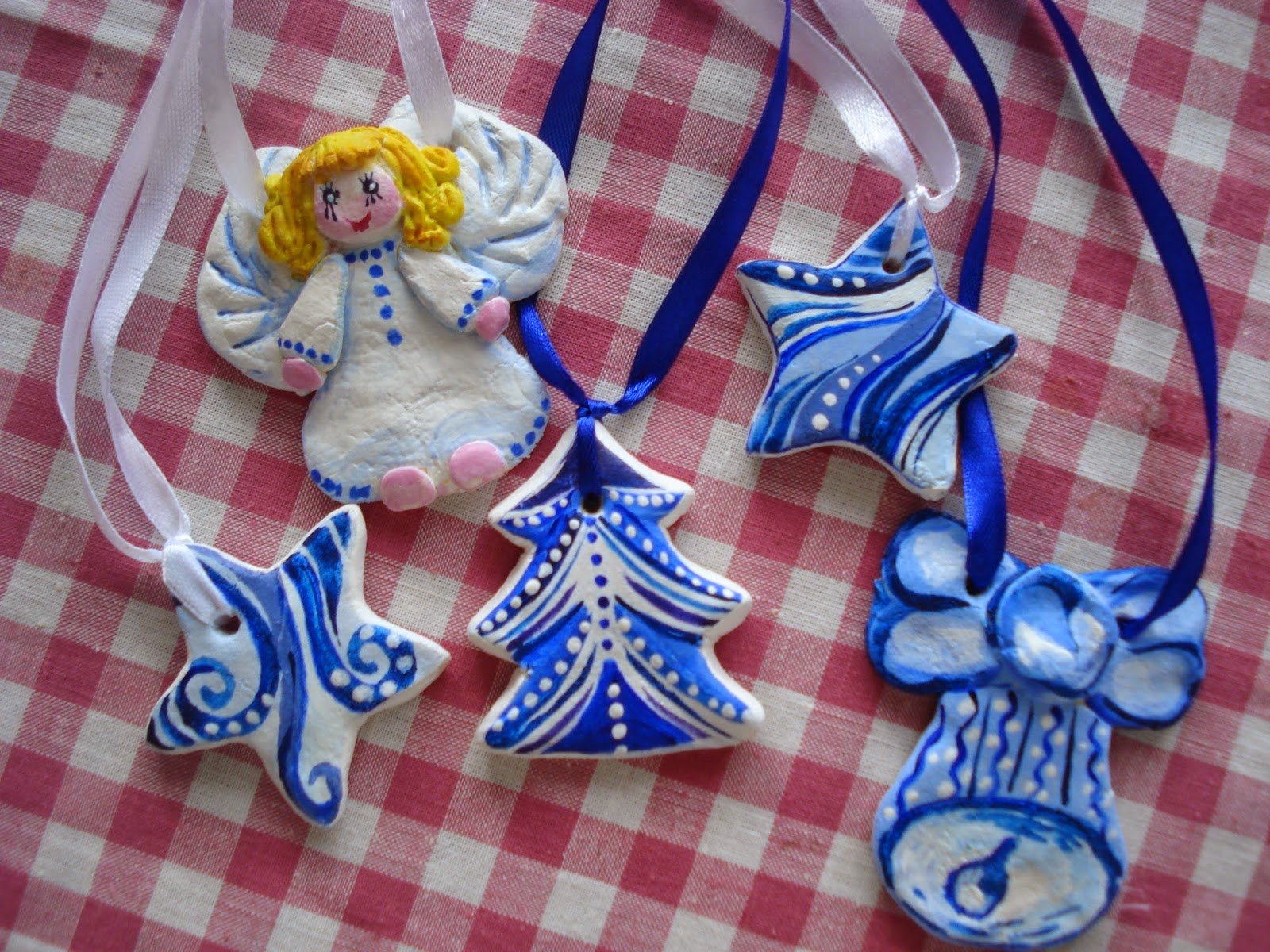 Después del secado completo, las artesanías de Año Nuevo se decoran con cualquier elemento (cintas, botones, cuentas, pedrería). Si haces agujeros en el centro de los juguetes, puedes crear una guirnalda brillante y original.