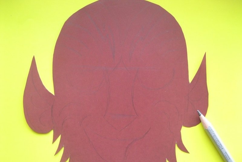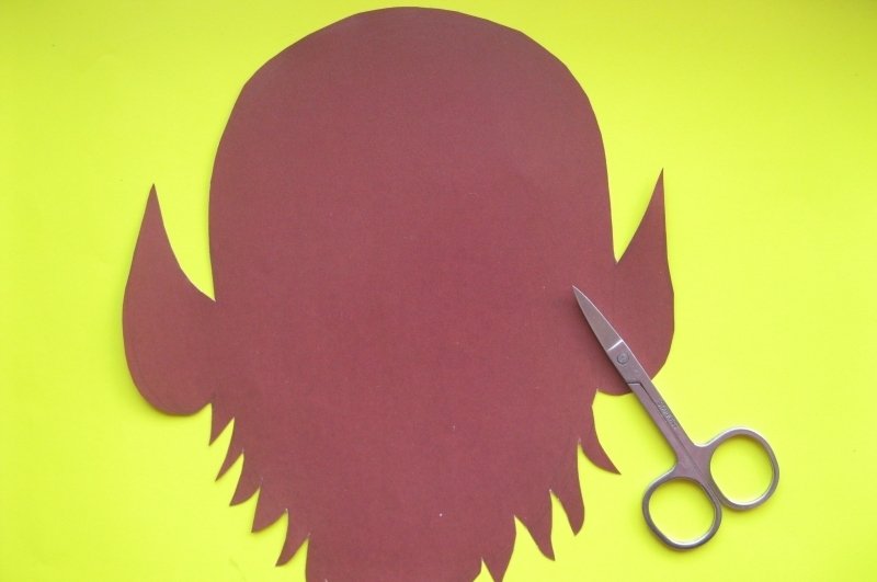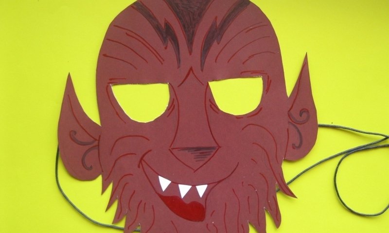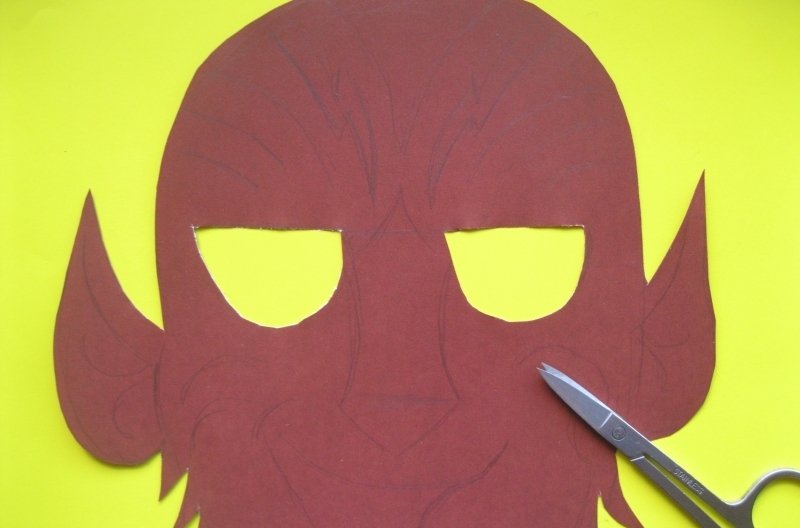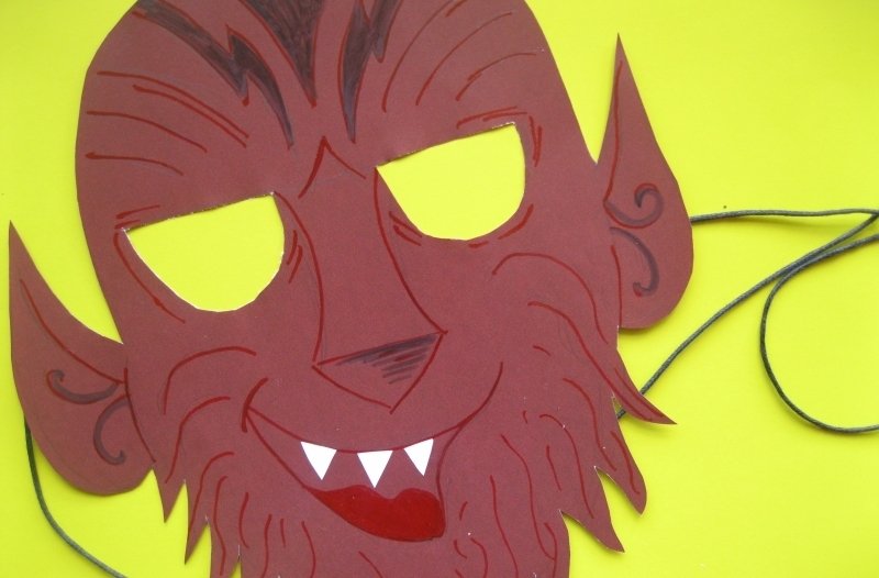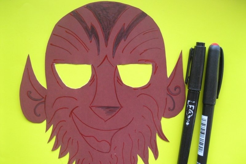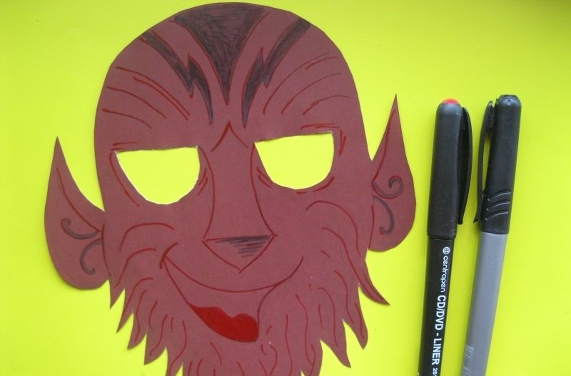 A partir de plastilina, que se necesitará aproximadamente un kilogramo, se forma una forma de fantasía que representa, por ejemplo, un demonio con cuernos. También necesitará agua, periódico y papel higiénico, pegamento de PVA, pinturas de gouache en varios colores. Después de pegar la construcción con una o dos capas de papel rasgado humedecido con agua, encima, impregnado con pegamento. En total, se hacen de seis a ocho capas, dependiendo de la densidad del papel. A partir de trozos más grandes de papel delgado, se forma que es difícil de modelar: se crean arrugas faciales, arrugas en la cara, cuernos, orejas puntiagudas. La última capa, para una mayor rigidez, está hecha de papel con mayor densidad. Es importante no olvidar dejar ranuras para los ojos, las fosas nasales y la boca. El diseño está bien seco, retirado de la base, pintado en colores rojo y negro, pegado con destellos.