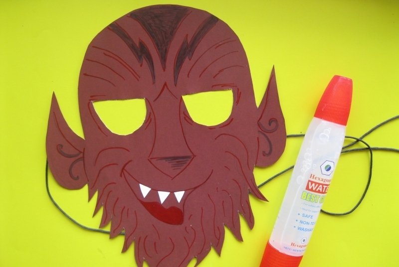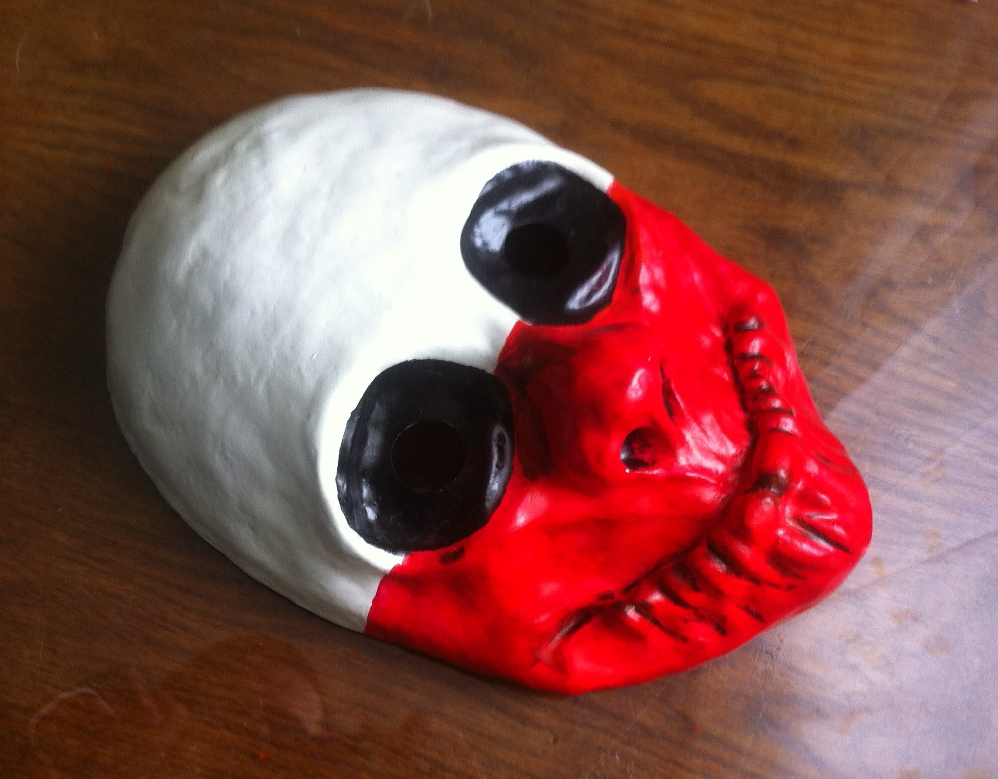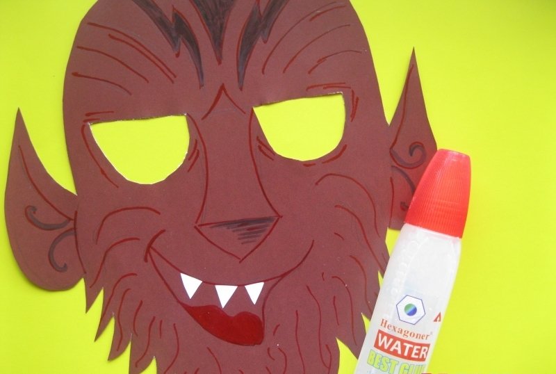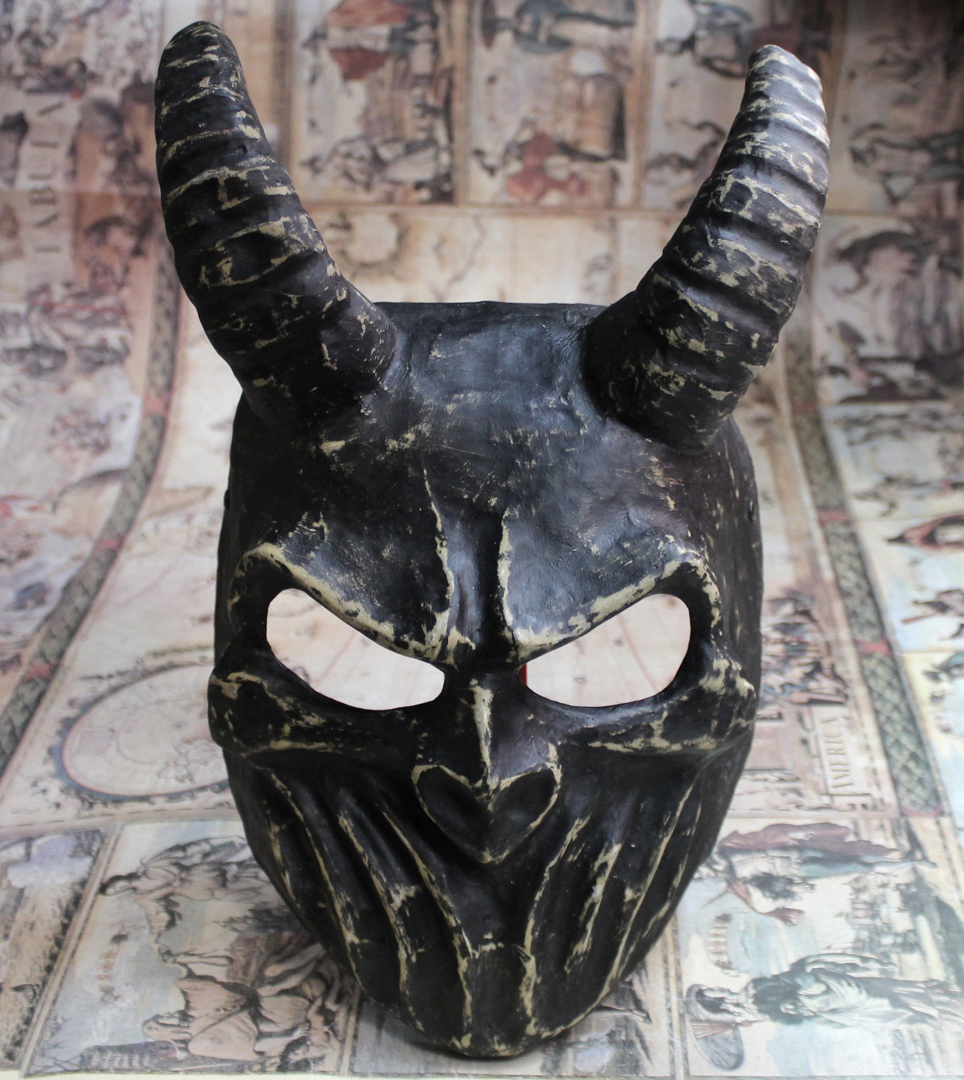 A partir de plastilina, que se necesitará aproximadamente un kilogramo, se forma una forma de fantasía que representa, por ejemplo, un demonio con cuernos. También necesitará agua, periódico y papel higiénico, pegamento de PVA, pinturas de gouache en varios colores. Después de pegar la construcción con una o dos capas de papel rasgado humedecido con agua, encima, impregnado con pegamento. En total, se hacen de seis a ocho capas, dependiendo de la densidad del papel. A partir de trozos más grandes de papel delgado, se forma que es difícil de modelar: se crean arrugas faciales, arrugas en la cara, cuernos, orejas puntiagudas. La última capa, para una mayor rigidez, está hecha de papel con mayor densidad. Es importante no olvidar dejar ranuras para los ojos, las fosas nasales y la boca. El diseño está bien seco, retirado de la base, pintado en colores rojo y negro, pegado con destellos.