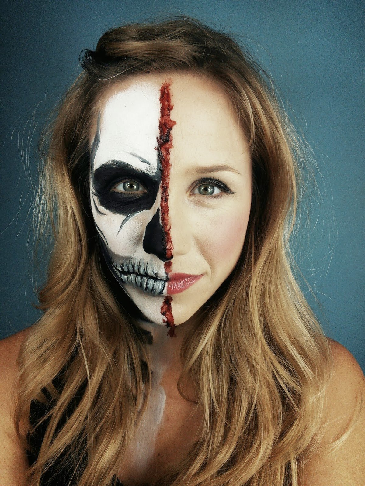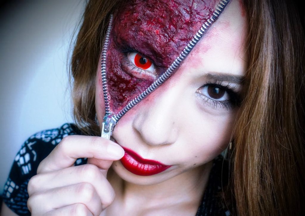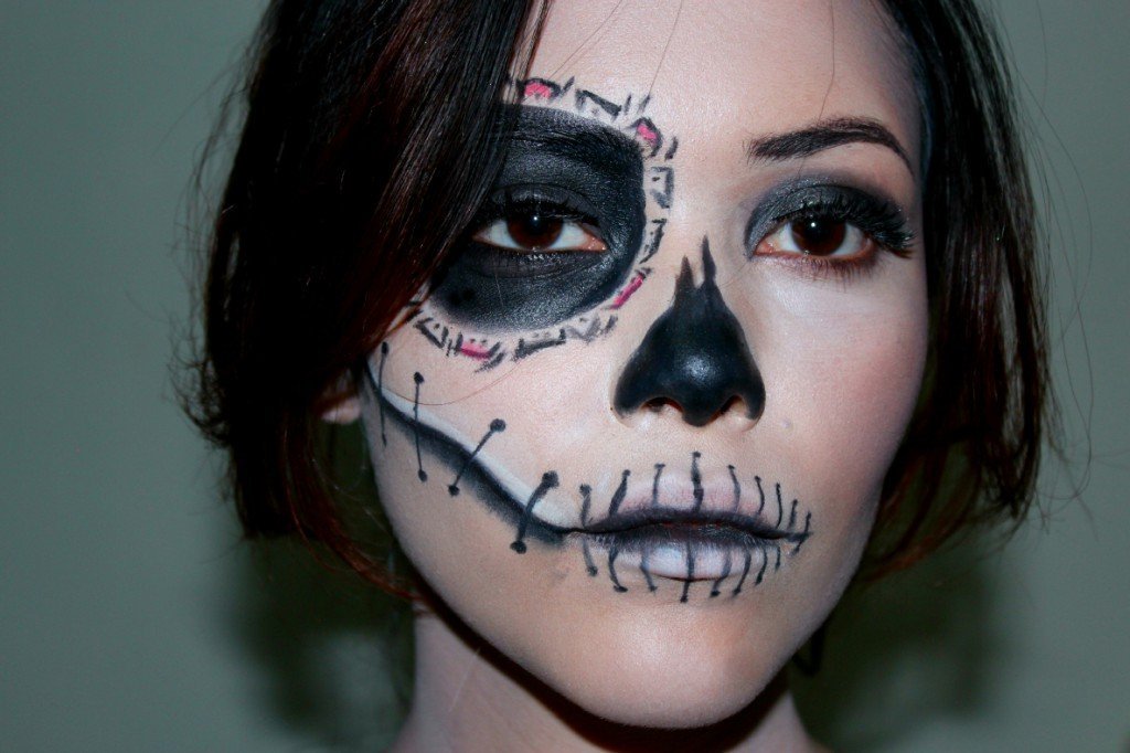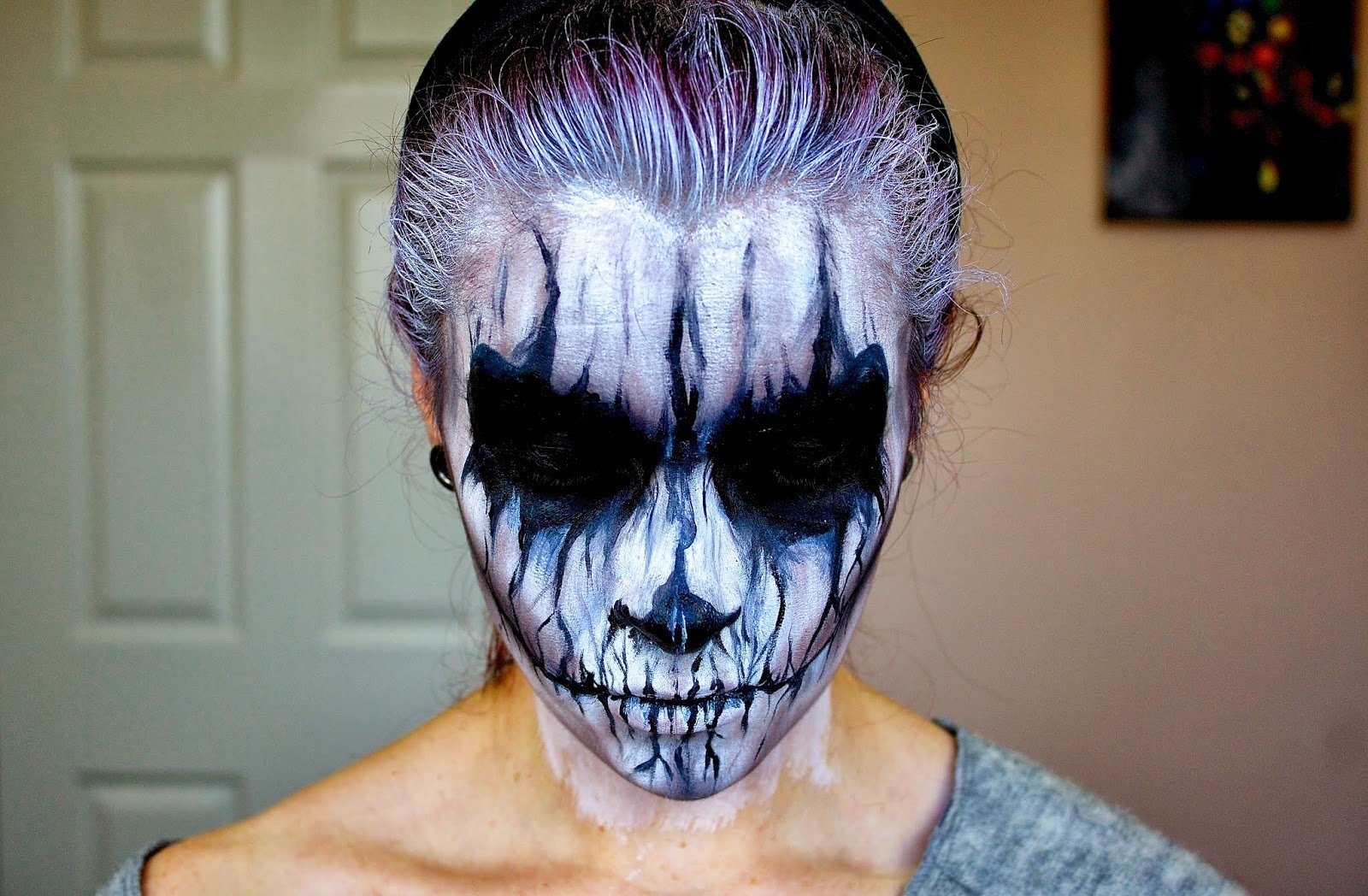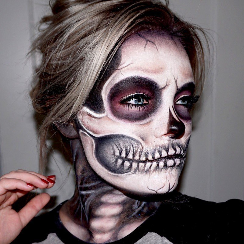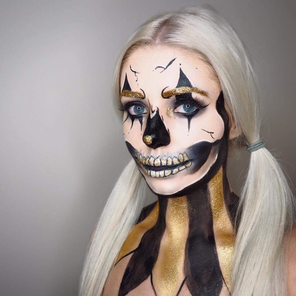 Para adolescentes y adultos, el maquillaje de Halloween está repleto de tonos oscuros, imitaciones de grietas, cicatrices, hematomas, hematomas y flechas "diabólicas". Para entornos más amplios, se aplica delineador en gel o esmalte de uñas negro a los dientes frontales. A los niños se les da coloración menos aterradora y cosméticos, hipoalergénicos. Tonos rosa y azul aceptables, una apariencia de azul debajo de los ojos, dientes de vampiro, pequeñas cicatrices y corazones.