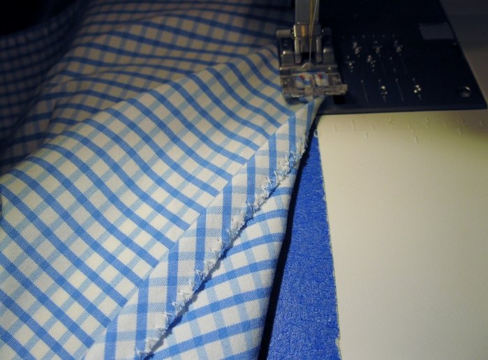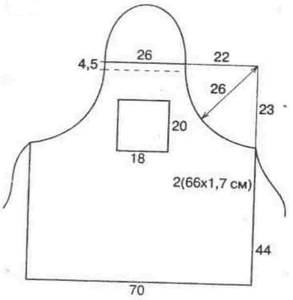 El delantal de la pierna resultará ser de gran tamaño, en toda la longitud del producto. Hacemos un patrón de acuerdo con una plantilla, nuestro propio diseño o un delantal existente. Procesamos los bordes con un recorte, por ejemplo, con un recorte oblicuo. Usamos la misma cinta para corbatas. El material de recorte irá a los bolsillos de forma arbitraria.