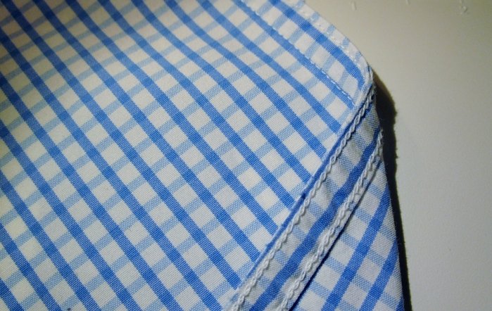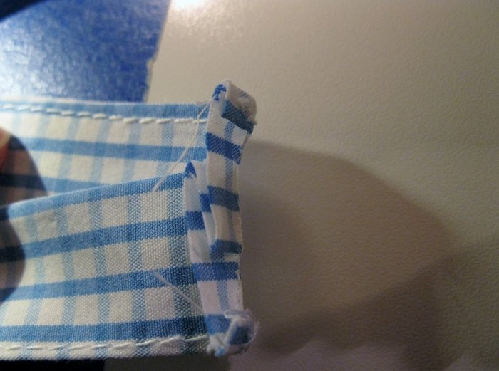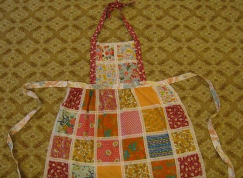 Puede dejar el delantal en su forma original o hacer una muesca. Para hacer esto, dobla el producto por la mitad, marca una curva suave en el último cuadrado en la segunda fila y corta parte de la tela a través de ambas capas. El forro ayuda a ocultar una gran cantidad de costuras desde el interior. Adjuntamos el delantal futuro a una pieza de tela lisa, cortada a lo largo del contorno con un pequeño margen. Adjuntamos entre sí ambas partes con los lados equivocados y cosimos. Recorta los bordes con rayas blancas. Del mismo material, puedes hacer corbatas.