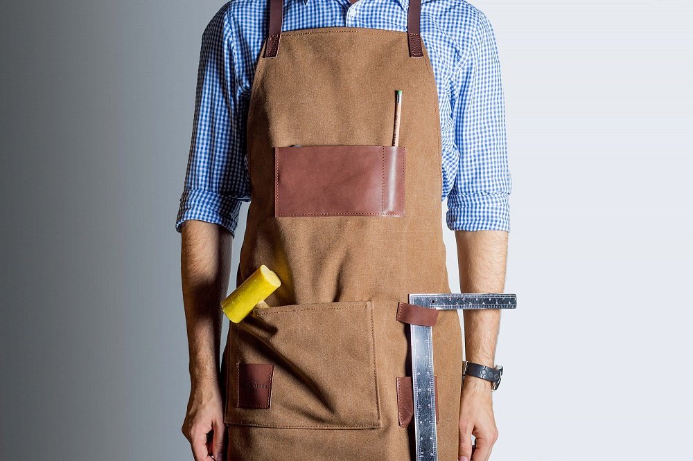 Un delantal para papá puede ser no solo cocina. Para trabajar en el garaje, la casa también necesitará protección confiable de la ropa. Por lo general, se trata de un vendaje de tela en el cinturón con muchos bolsillos para guardar herramientas. Tal delantal se puede decorar con bordados modestos y una pegatina con nombre.