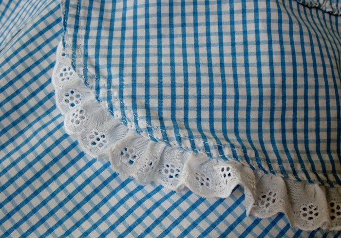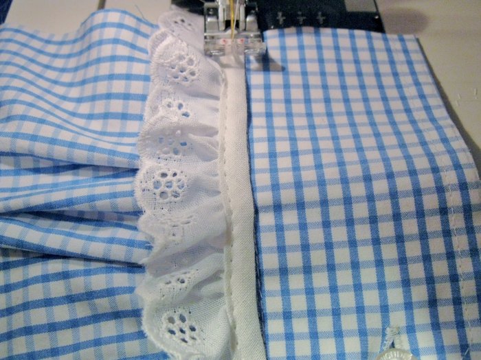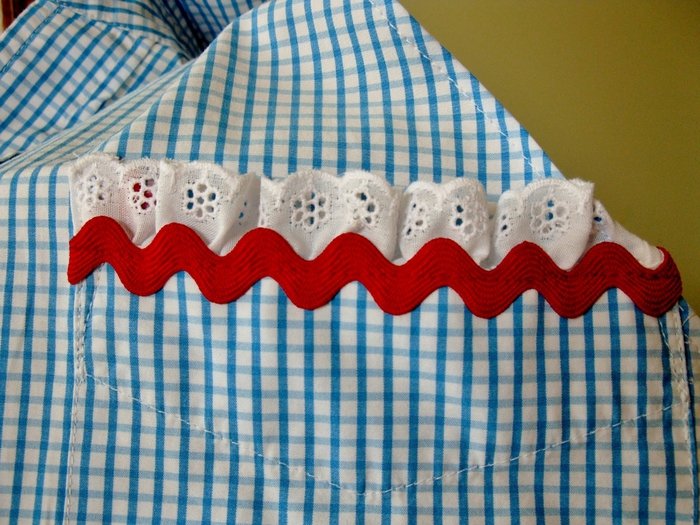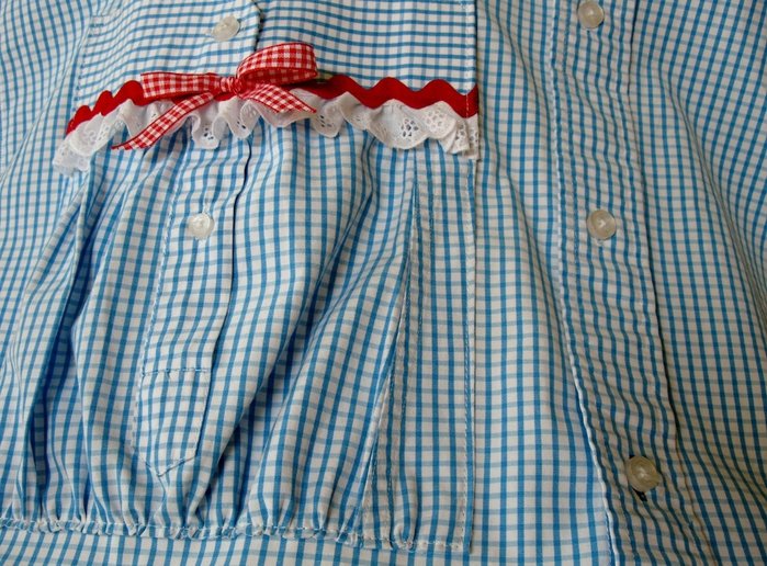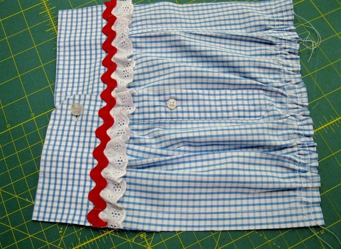 Decoramos la costura horizontal al nivel del pecho con volantes, volantes y cintas decorativas;