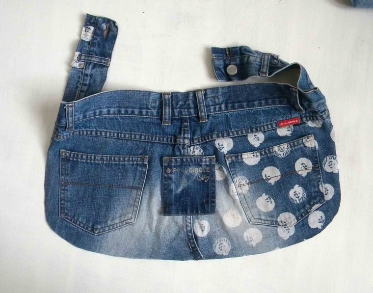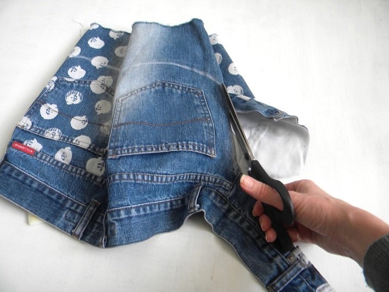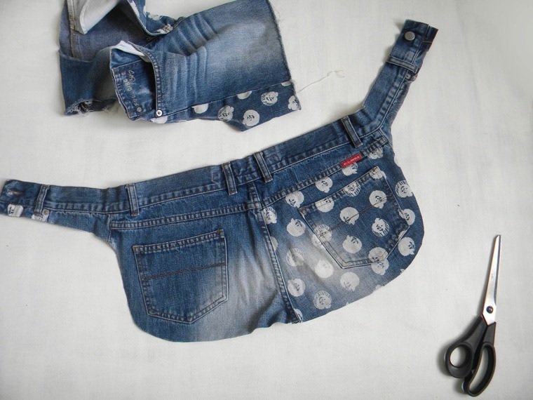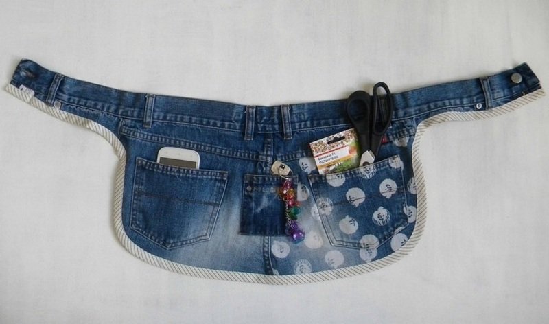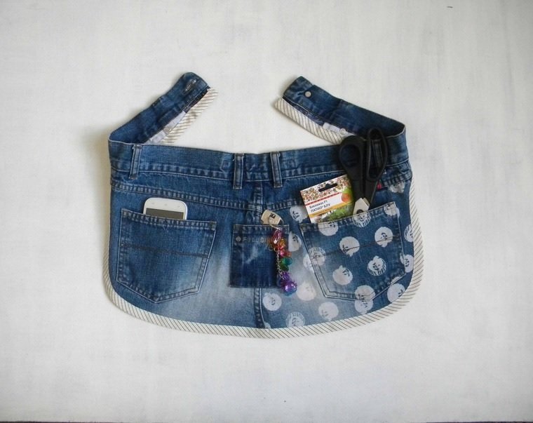 Los pantalones viejos e innecesarios se pueden convertir fácilmente en un delantal original en un estilo informal. Hay varias formas de abrir jeans: use una de las piernas o cosa solo desde la parte superior con los bolsillos traseros.