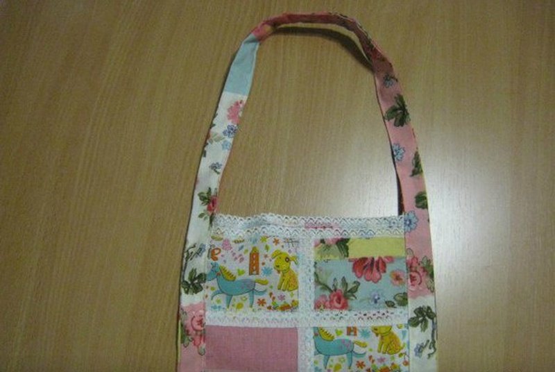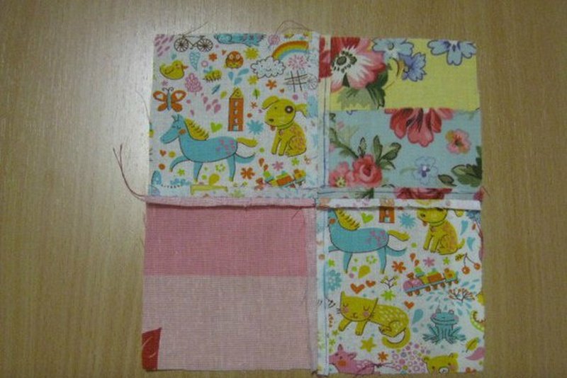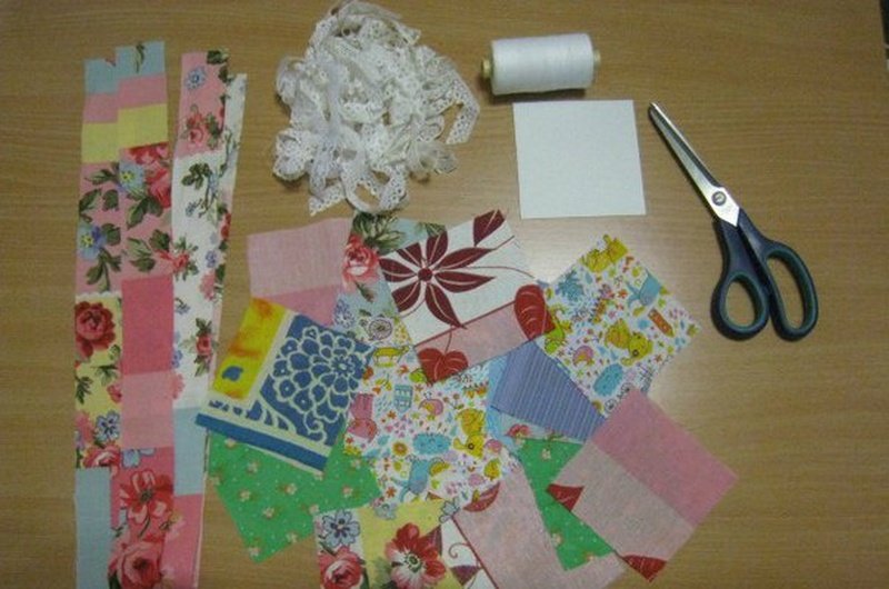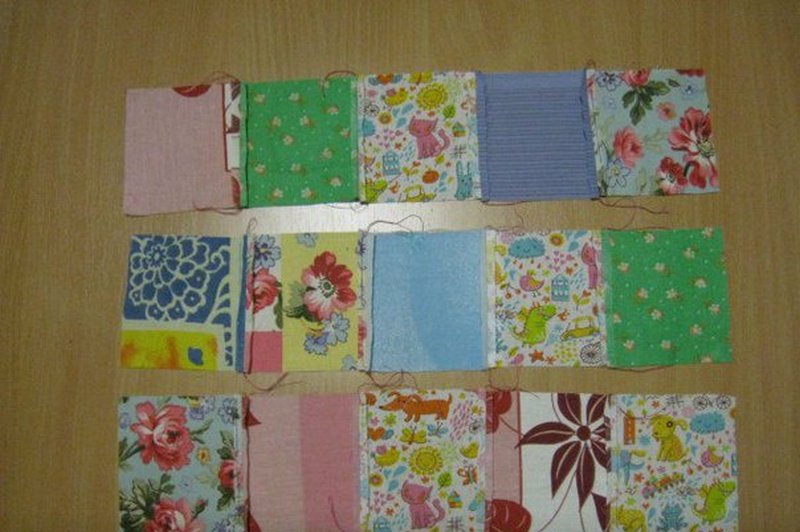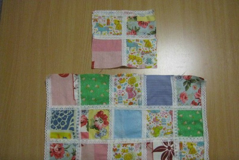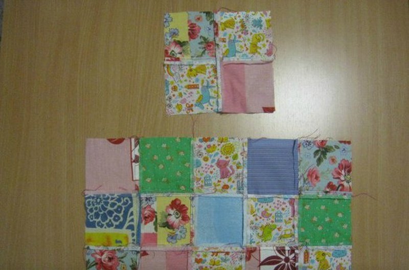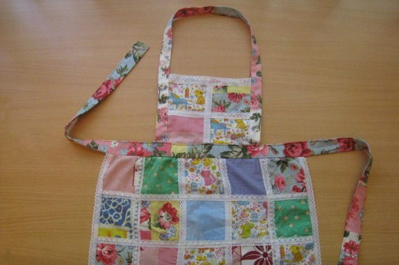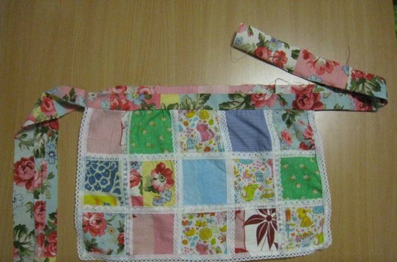 Para el trabajo, preparamos 30 trapos del mismo tamaño. Pueden tener diferentes formas, pero será más fácil para las costureras novatas trabajar con los mismos cuadrados. Conectamos 6 piezas en una tira y cosimos. También hacemos 3 espacios en blanco más. Ahora colóquelos en un rectángulo grande y cóselos. Conectamos 4 cuadrados y los colocamos en el centro de la parte principal. De los 2 cuadrados, formamos la parte superior del delantal.