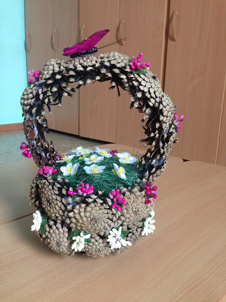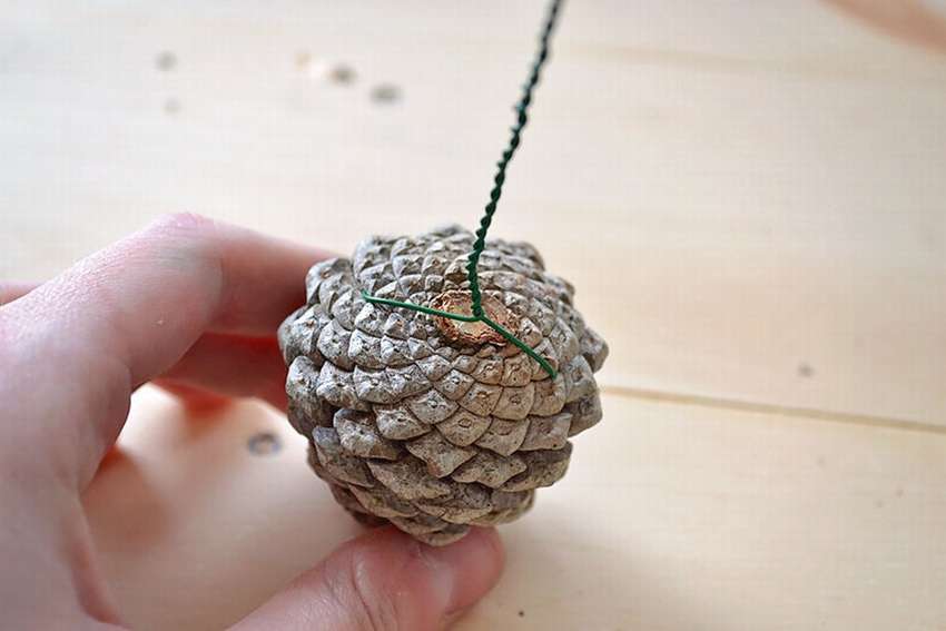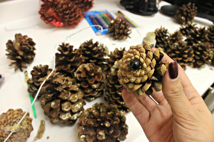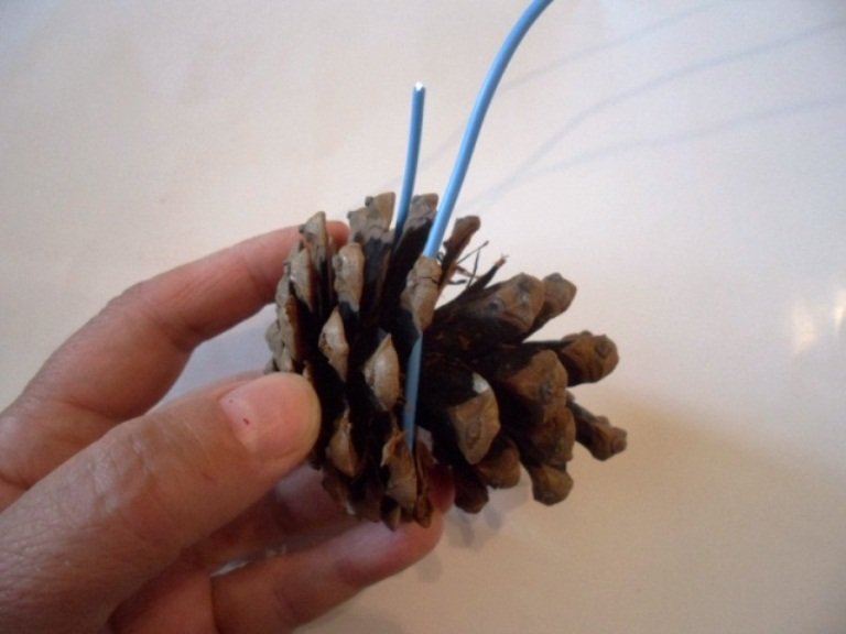 Para hacer un bolígrafo, tome un alambre pequeño o un hilo de pescar de grosor medio. Para esta parte, necesita nueve conos pegados, y todos, excepto el superior, central, se vuelcan. Para una mayor durabilidad, un mango hecho de conos no solo debe estar pegado, sino también envuelto con hilo de pescar, sino que no sea demasiado visible. El artículo está enrollado y pegado a la parte principal de la cesta. Cuentas, la parte exterior está decorada con cuentas, cintas, pedrería, flores secas, barnizadas con destellos.