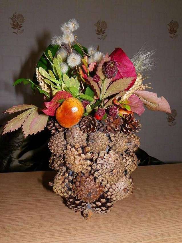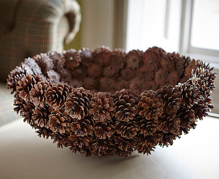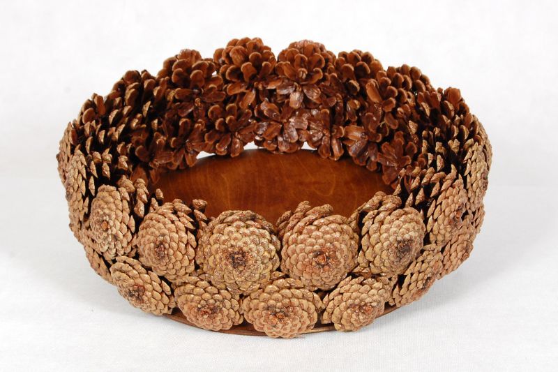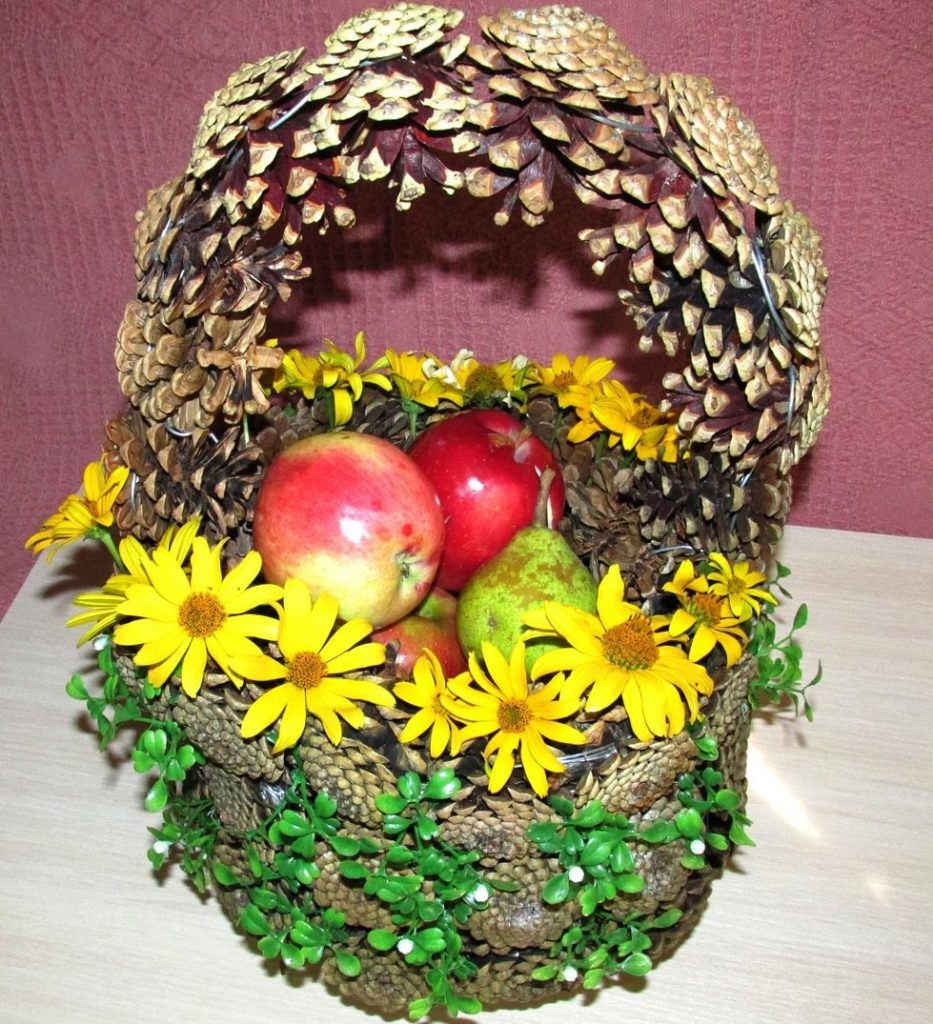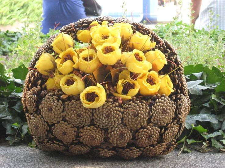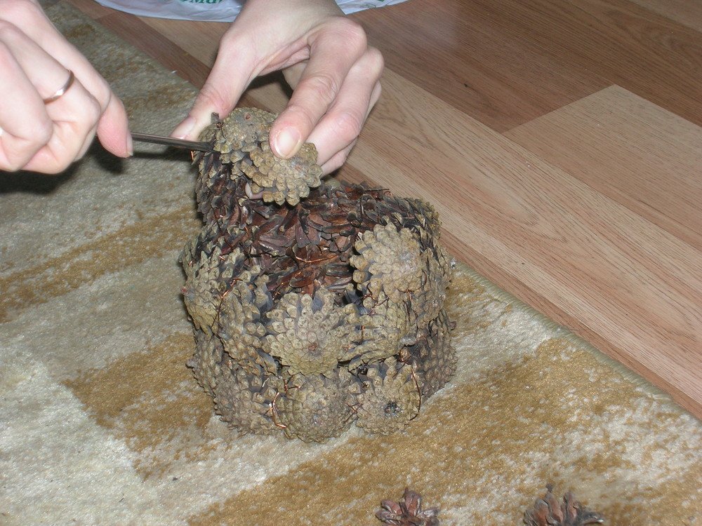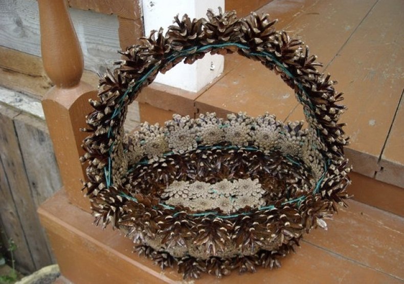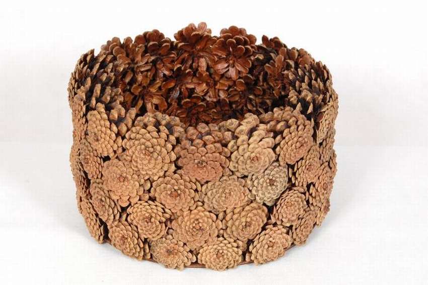 Para crear una hermosa canasta en forma de media bola, se usa una bola de espuma grande, envuelta con papel de aluminio en el medio. El pegamento se aplica directamente a este último, los conos se unen lo más cerca posible entre sí. Cuando el producto se seca, se retira la bola y el jarrón se llena de flores, musgo y otras decoraciones.