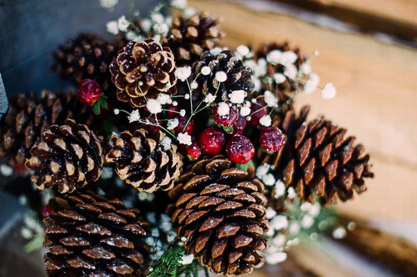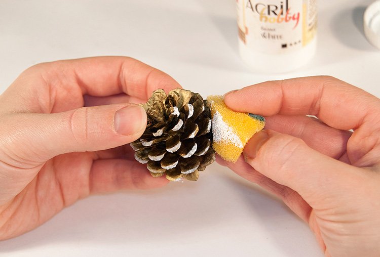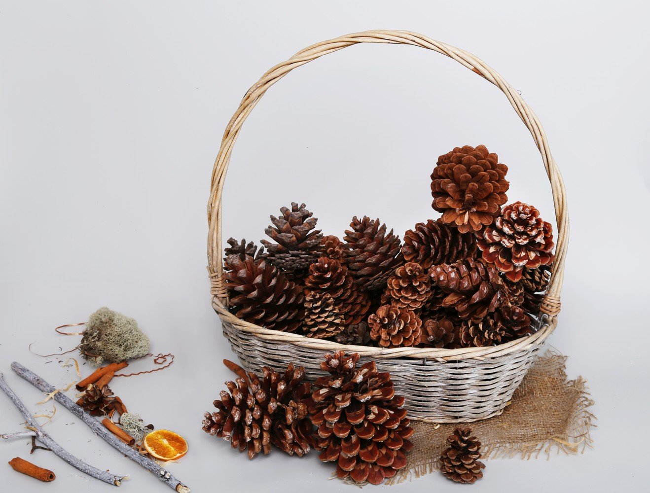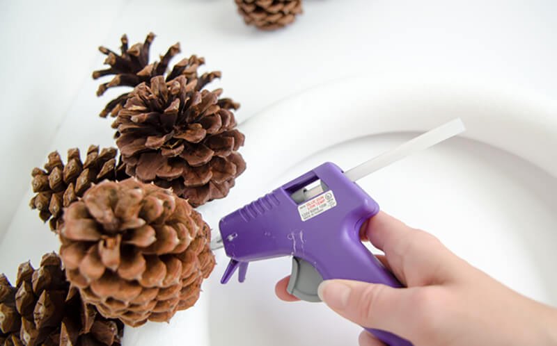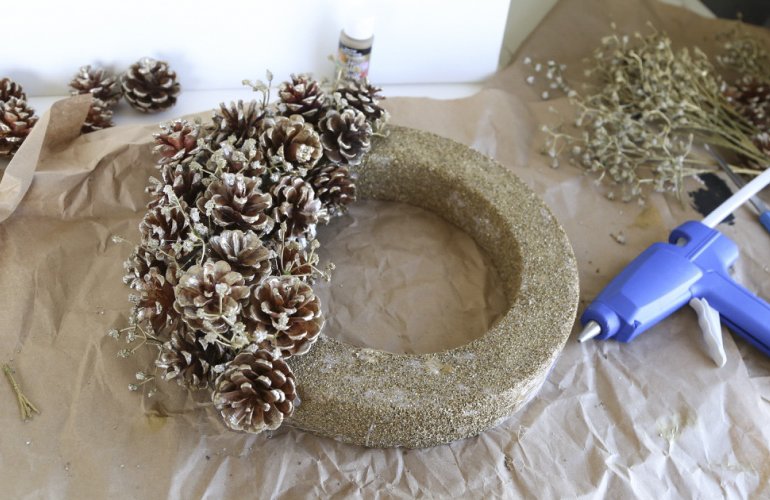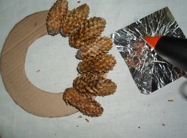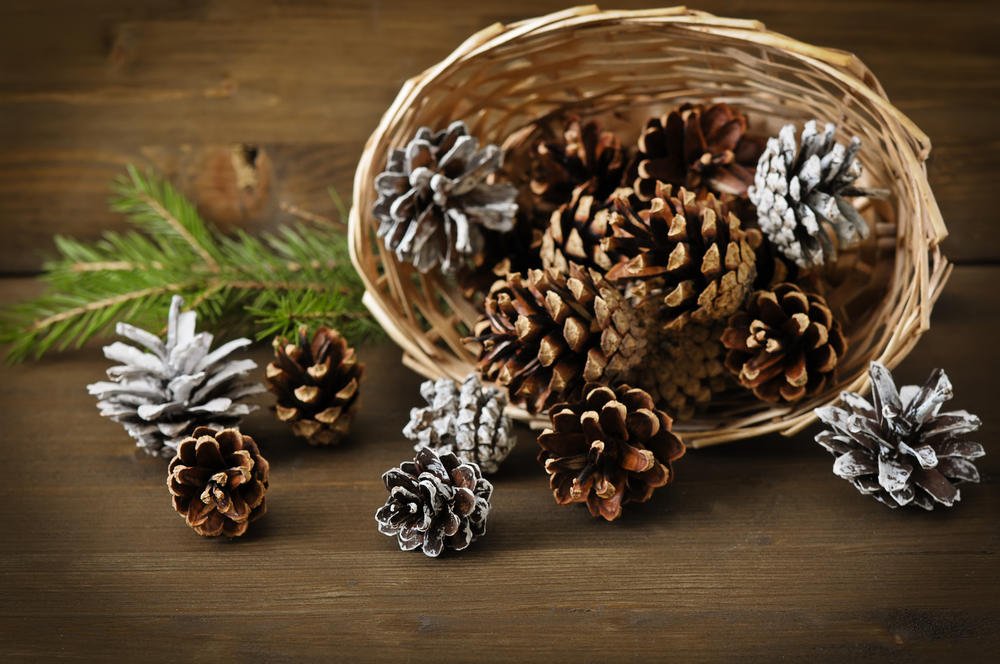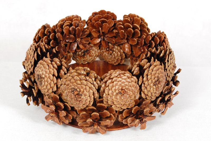 Para crear una hermosa canasta en forma de media bola, se usa una bola de espuma grande, envuelta con papel de aluminio en el medio. El pegamento se aplica directamente a este último, los conos se unen lo más cerca posible entre sí. Cuando el producto se seca, se retira la bola y el jarrón se llena de flores, musgo y otras decoraciones.